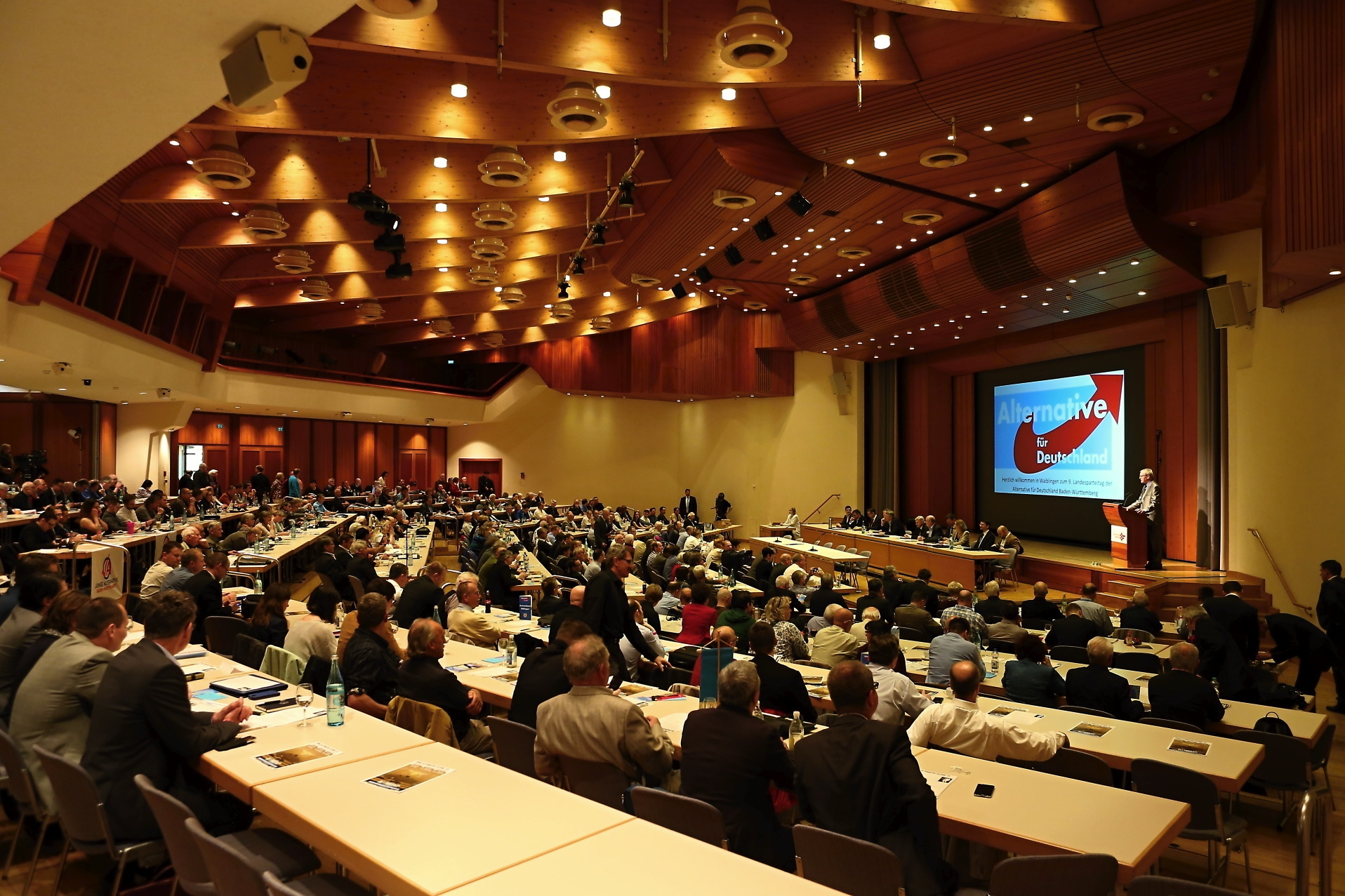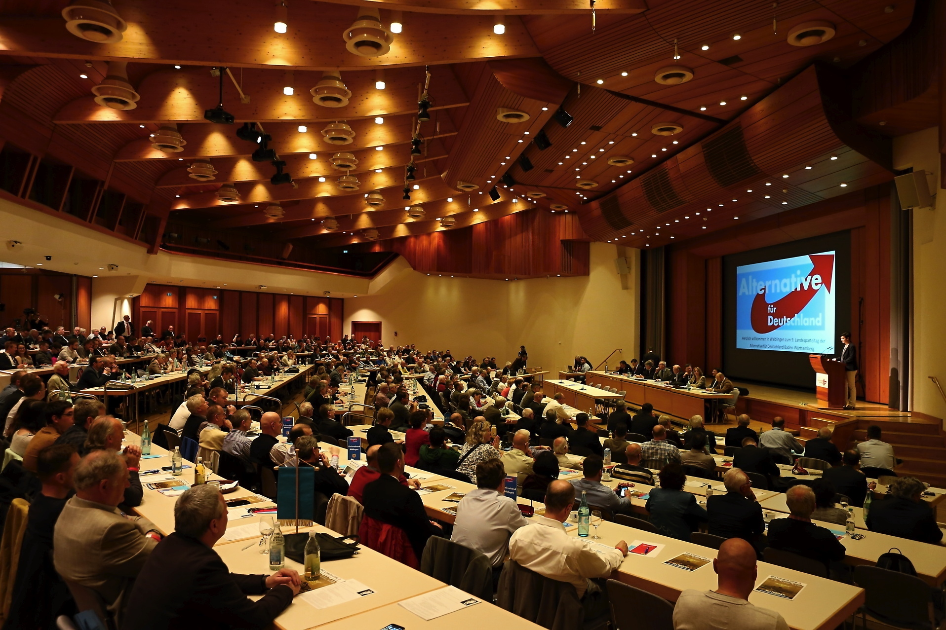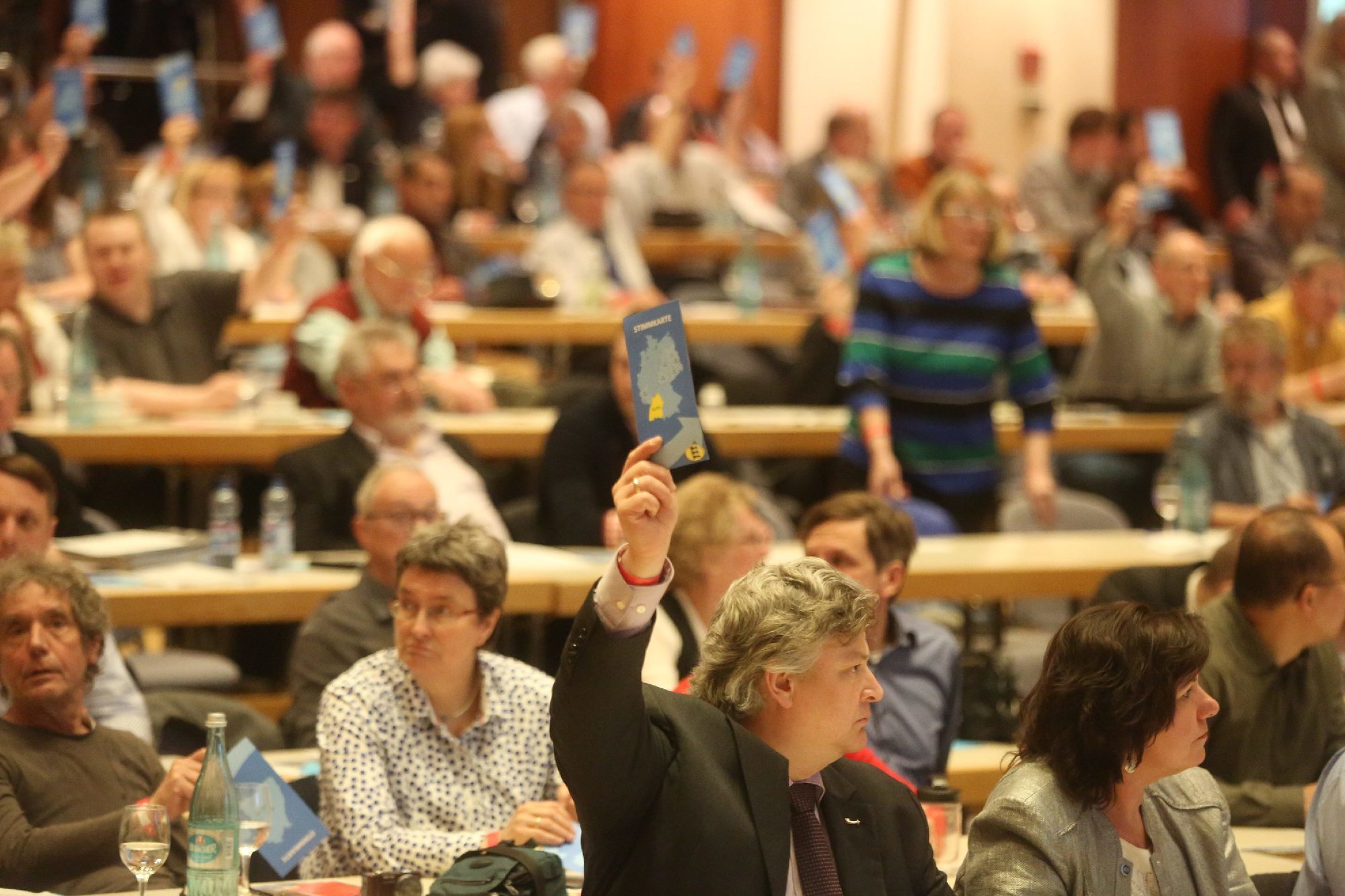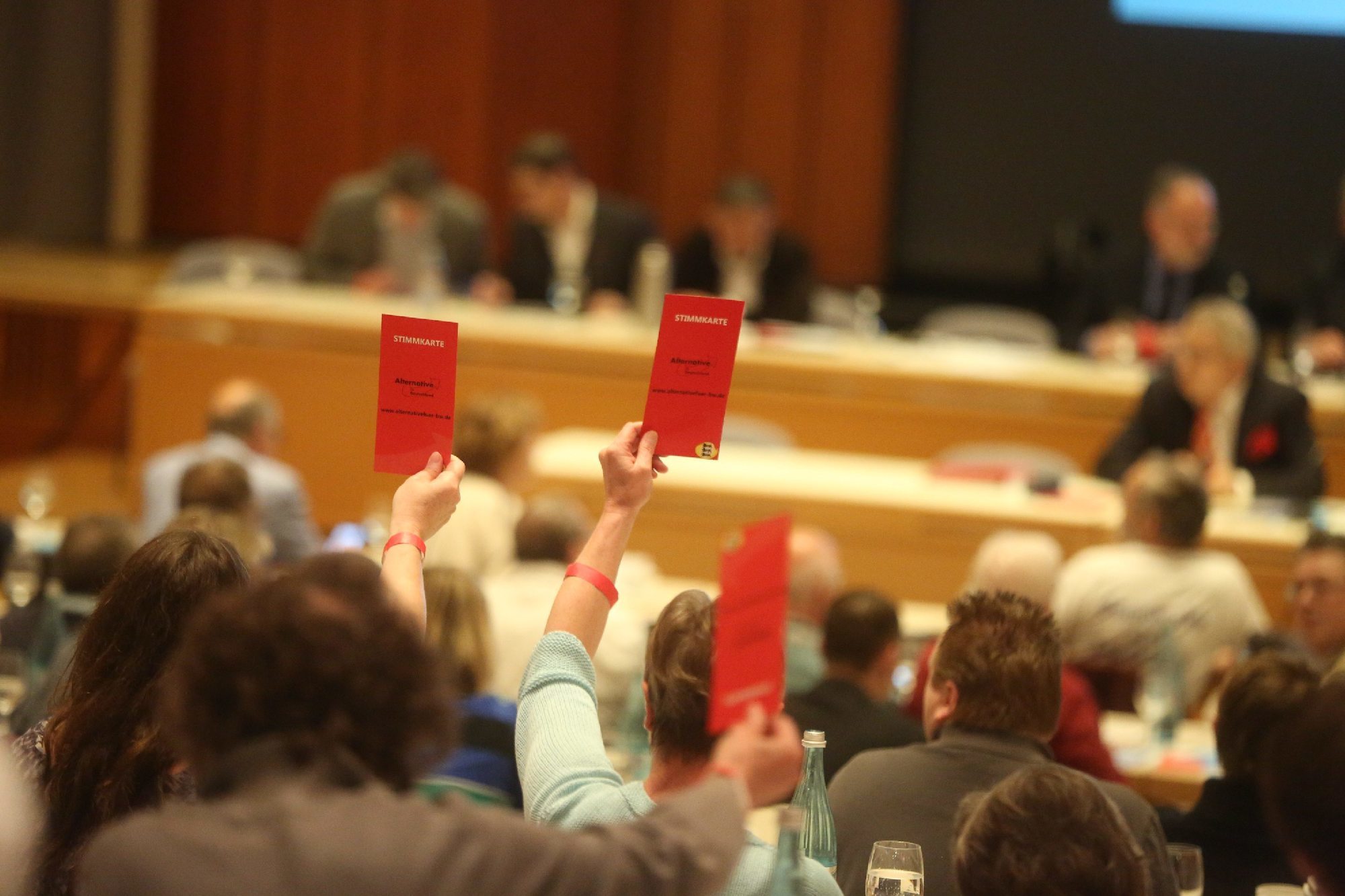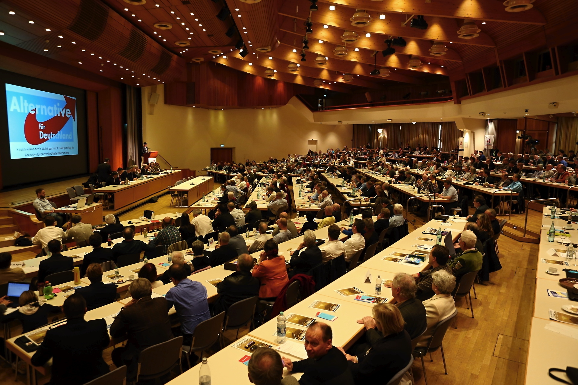 Im Saal tagen derweil rund 300 Mitglieder der AfD, darunter auch die 23 künftigen Landtagsabgeordneten. Wer in den Saal will, muss sich peniblen Kontrollen von Polizei und Security unterziehen lassen. Von dem Protest zeigen sich die Delegierten der AfD jedoch ungerührt. Sie scheinen ihn fast zu genießen. Die Stimmung im Saal ist entsprechend entspannt. Die Zufriedenheit über die 15,1 Prozent bei den Landtagswahlen ist den AfD-Mitgliedern noch deutlich anzusehen. Der Kreisvorsitzende Ralf Özkara jedenfalls meint selbstbewusst: "Wir sind die neue Volkspartei."