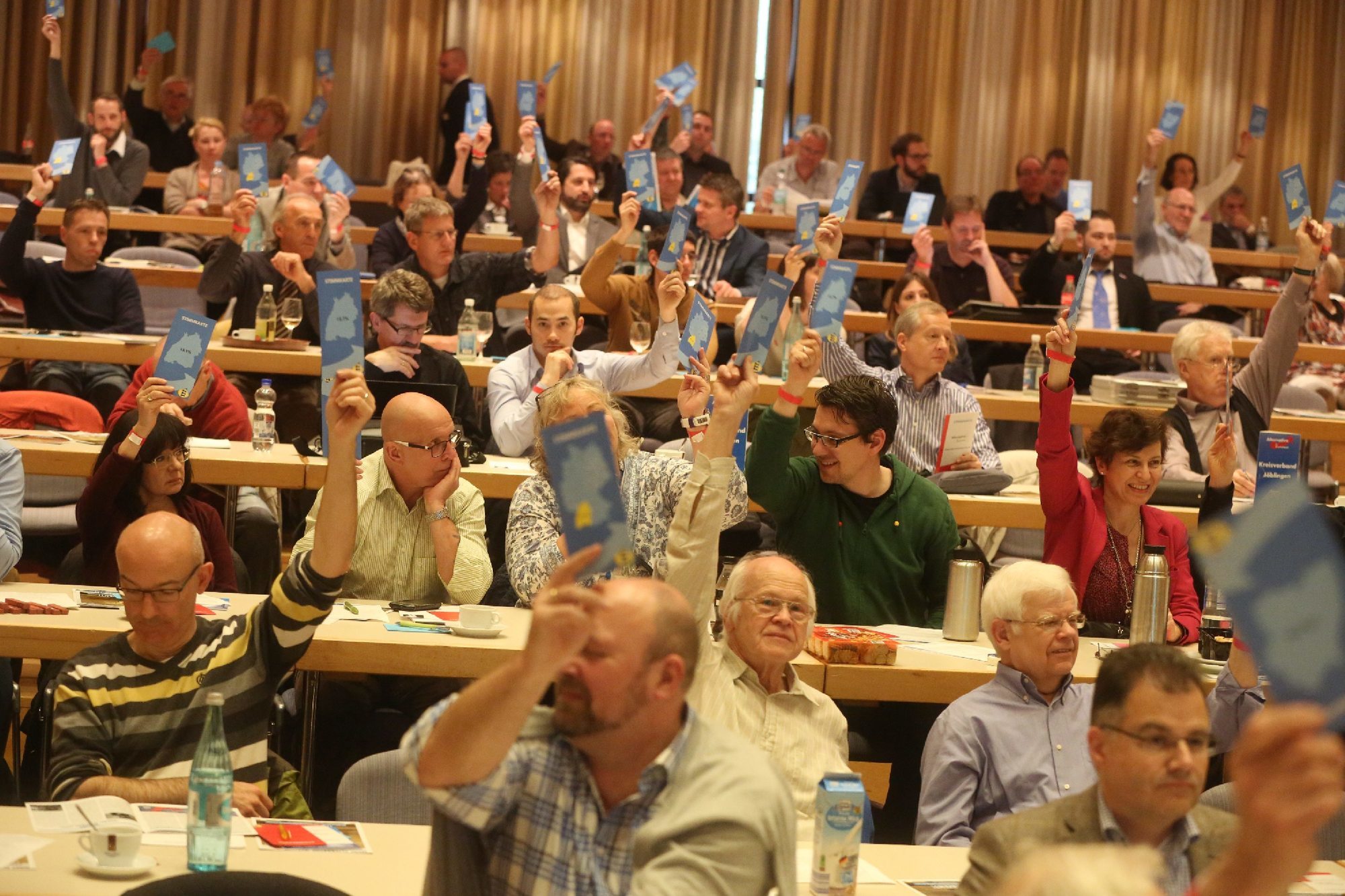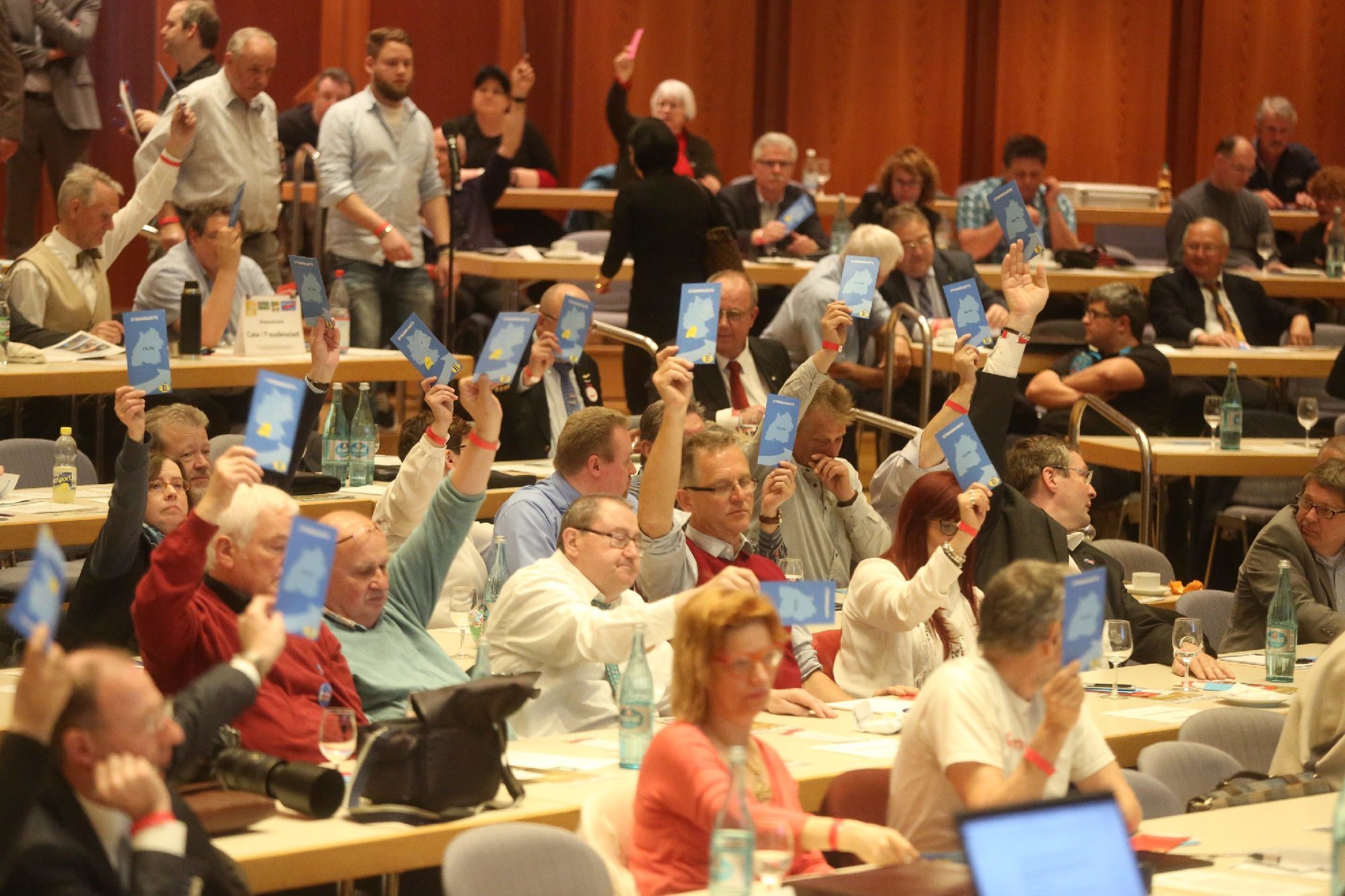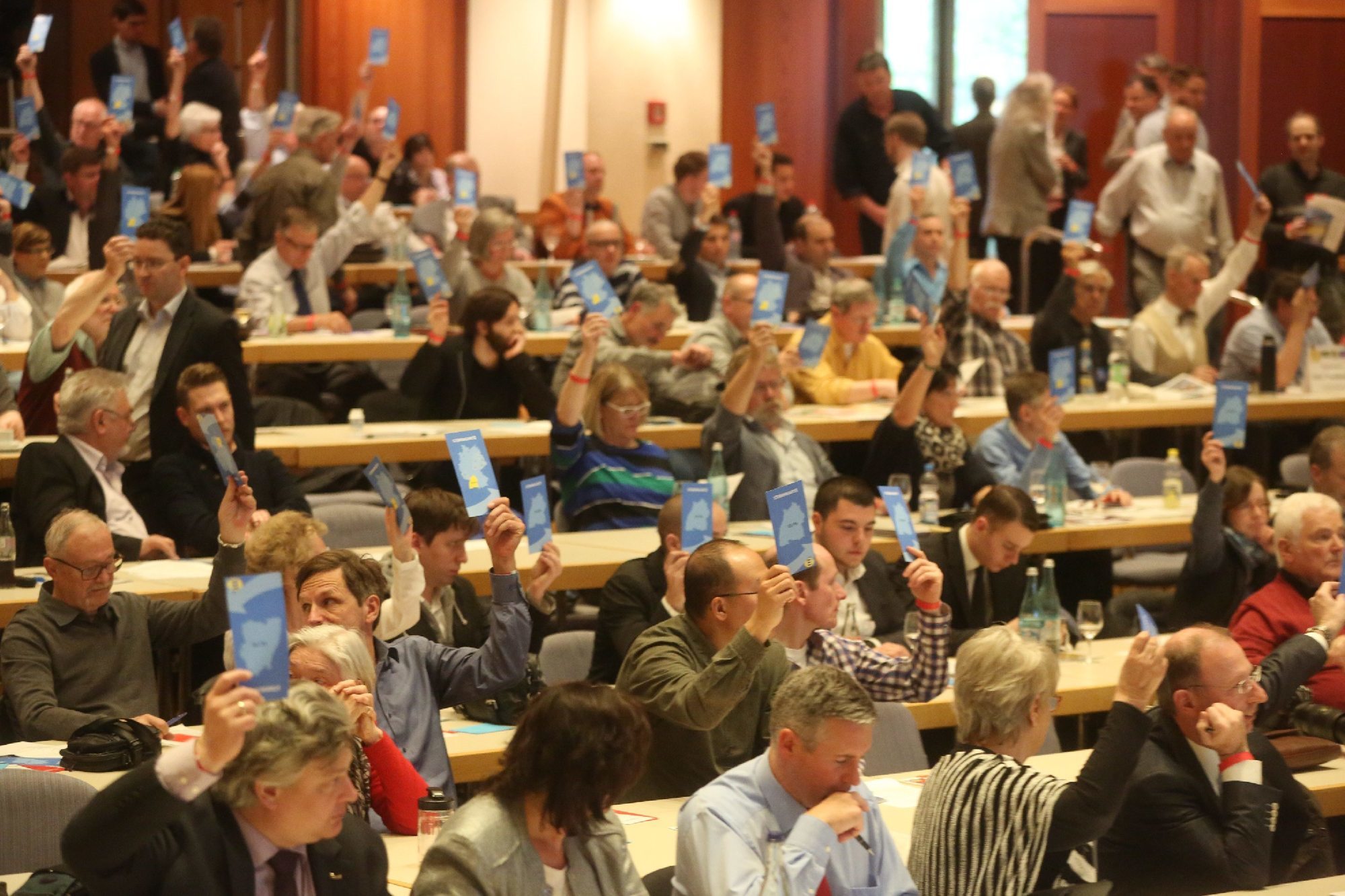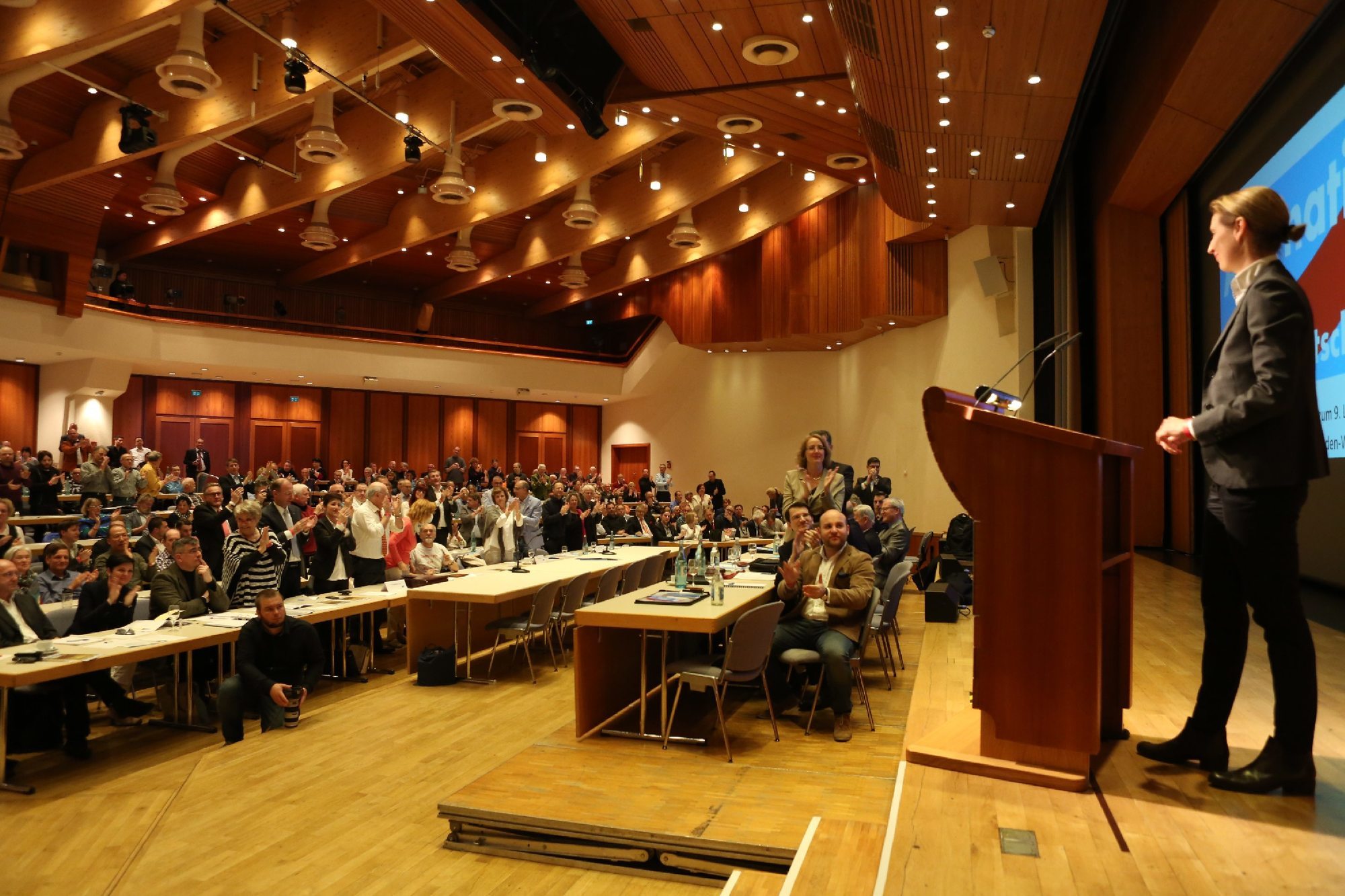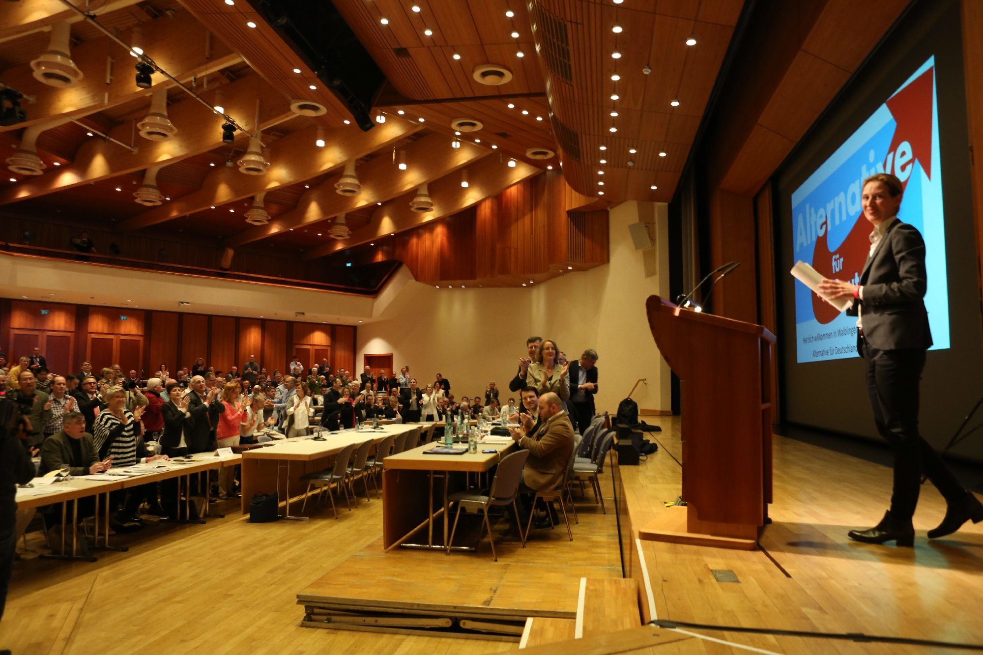 Im Saal tagen derweil rund 300 Mitglieder der AfD, darunter auch die 23 künftigen Landtagsabgeordneten. Wer in den Saal will, muss sich peniblen Kontrollen von Polizei und Security unterziehen lassen. Von dem Protest zeigen sich die Delegierten der AfD jedoch ungerührt. Sie scheinen ihn fast zu genießen. Die Stimmung im Saal ist entsprechend entspannt. Die Zufriedenheit über die 15,1 Prozent bei den Landtagswahlen ist den AfD-Mitgliedern noch deutlich anzusehen. Der Kreisvorsitzende Ralf Özkara jedenfalls meint selbstbewusst: "Wir sind die neue Volkspartei."