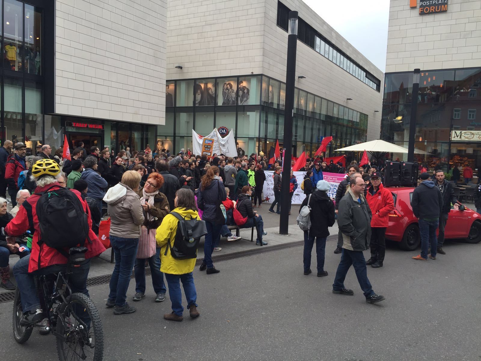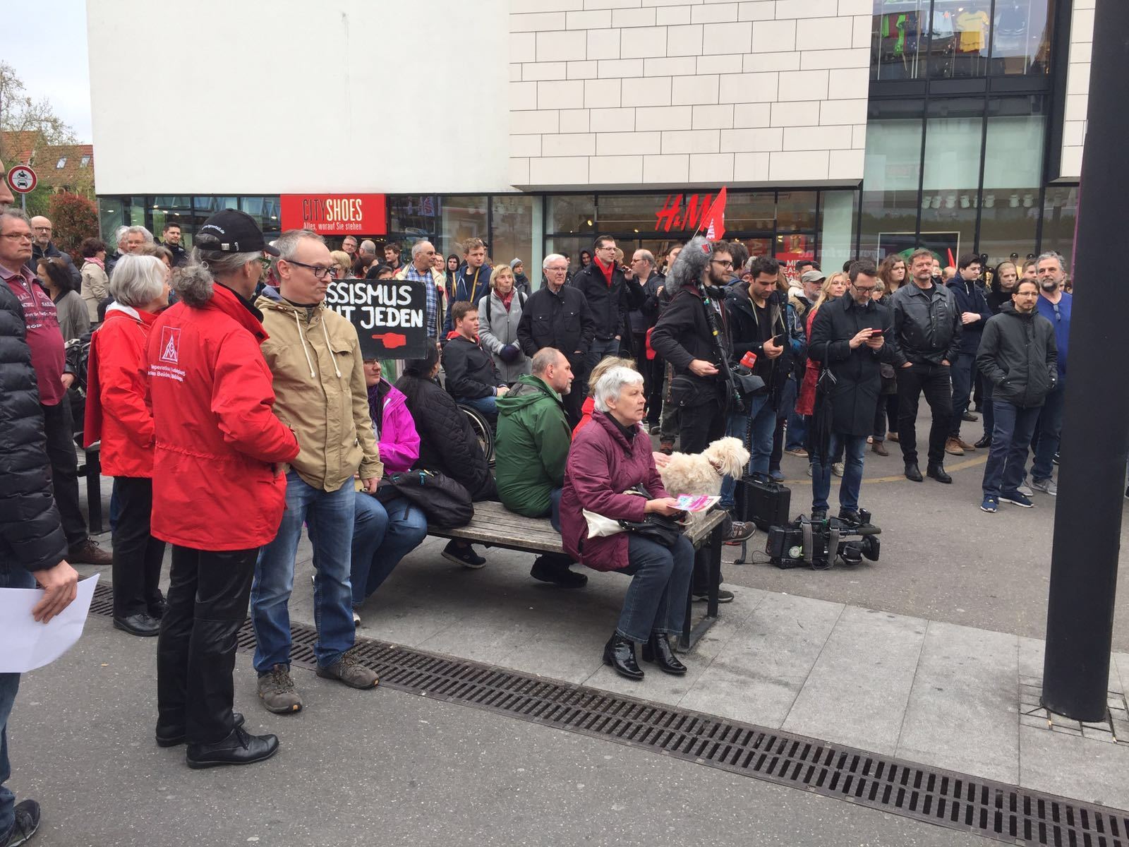 Alfonso Fazio von der Alternativen Liste hält während der Demonstration vor dem Bürgerzentrum eine hochemotionale Rede gegen die AfD (Ausschnitte davon sind in diesem Video zu sehen). Gegen 11 Uhr beginnen die AfD-Gegner dann mit einem Protestmarsch durch die Stadt. Am Alten Postplatz findet anschließend eine Abschlusskundgebung statt, die gegen 12 Uhr beendet ist.