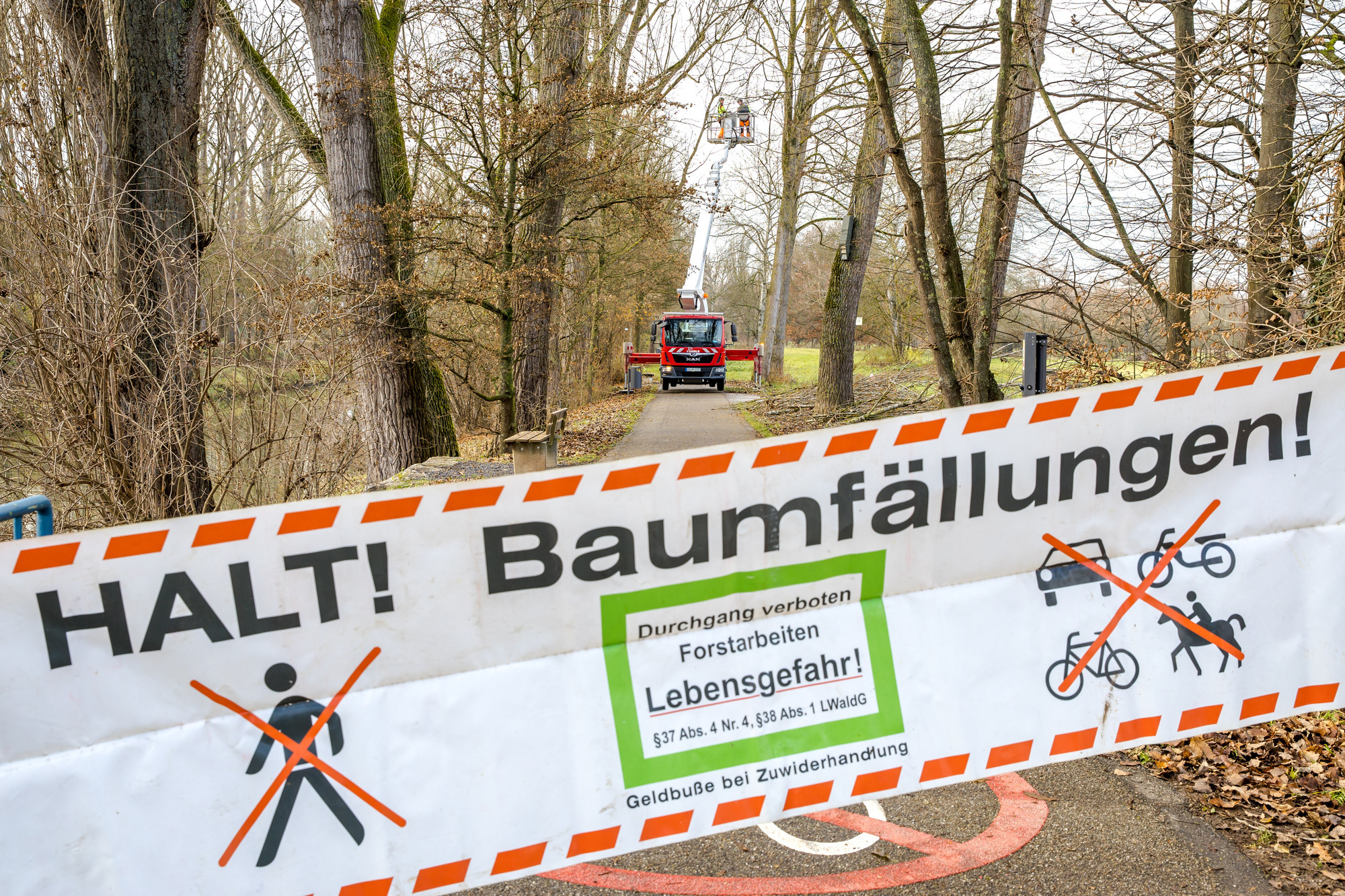 Waiblingen. An der Rems in Waiblingen, zwischen Kernstadt und Beinstein, arbeiten Gärtner zurzeit mit Hebebühnen und Sägen an Bäumen. Gefällt werden aber keine Bäume, teilt die Stadt Waiblingen auf Nachfrage mit - auch wenn auf einer Absperrung „Halt! Baumfällungen!“ steht. "Das sind übliche Baumpflegearbeiten an etwa 30 Pappeln entlang der Rems. Die Arbeiten an den Pappeln dauern noch diese Woche und voraussichtlich nächste Woche. In diesem Zuge werden immer kleinere Abschnitte des Weges