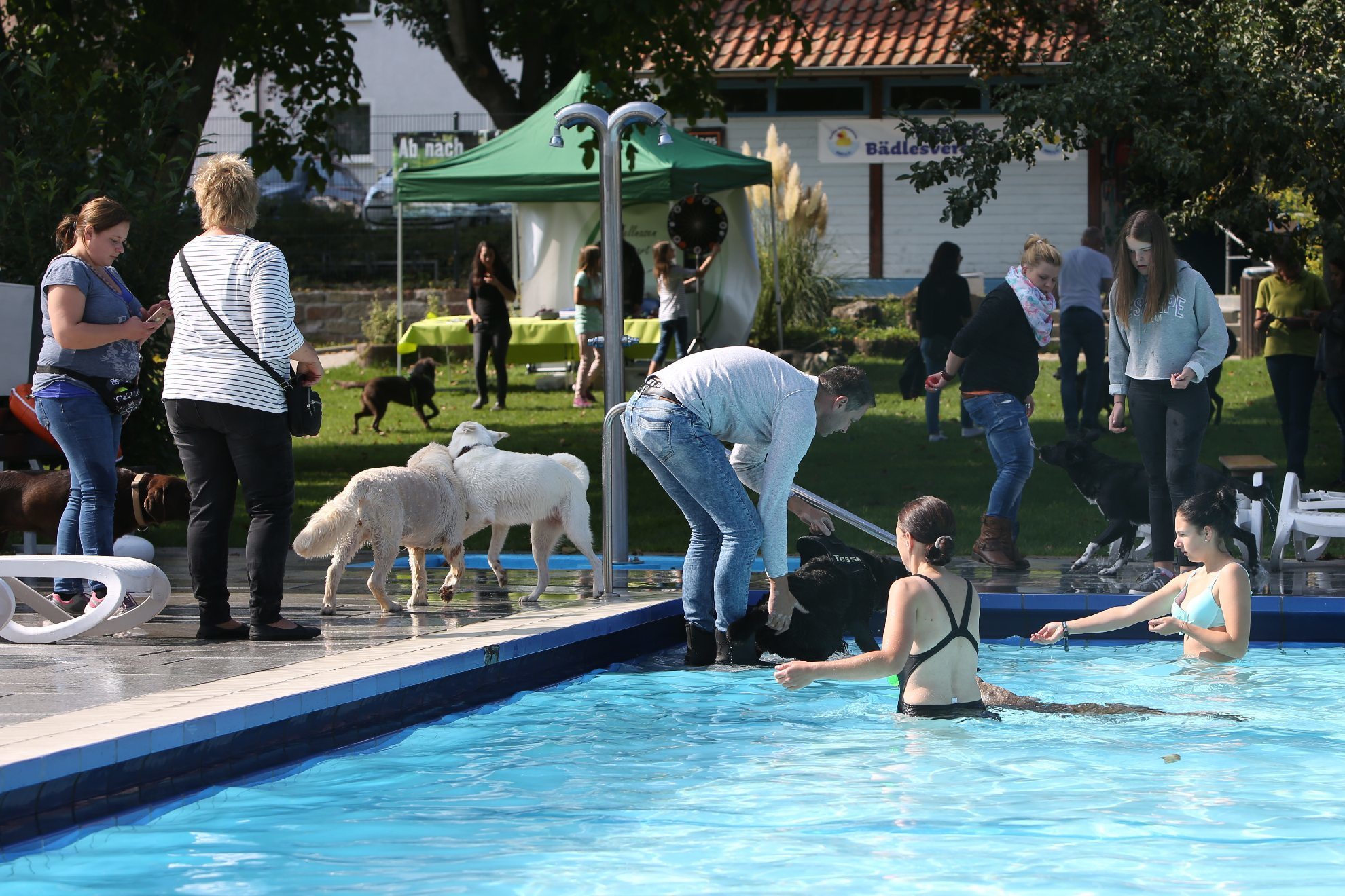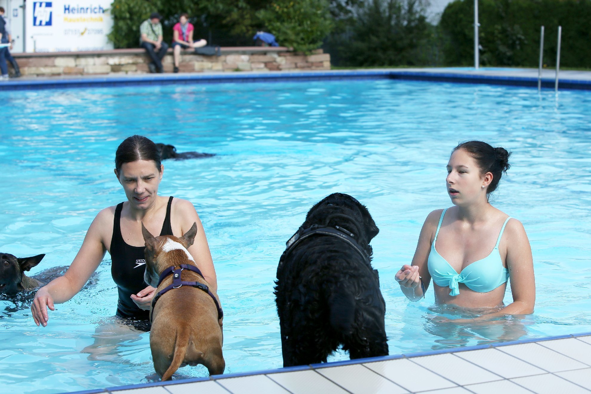 Am Wochenende war im Bädle der Hund los: Am Samstag kamen 485 Vierbeiner mit Begleitung, am Sonntag sogar 600. In den Anfangsjahren freilich waren es sogar rund 1500. „Die vielen, inzwischen uns nachgemachten Hundebadetage in anderen Freibädern sorgen dafür“, erklärt der Vereinsvorsitzende den Rückgang. Vom Mastiff mit 94 Kilo Lebendgewicht über den Labrador mit 58 Kilo bis zum Mini-Yorkshire-Terrier oder Minispitz – „etwa so groß wie ein gut gefütterter Goldhamster“ – war diesmal an Hunderassen alles vertreten. Die vermutlich weiteste Anreise hatte ein Hirtenhund. Er kam mit Herrchen und Frauchen aus Öhringen und war zum fünften Mal in Korb. Die Badetage verliefen völlig friedlich, berichtet Albert Heinrich: „Weder Mensch noch Tier war streitlustig.“ Auch inhaltlich war wieder viel geboten, denn mit elf Informationsständen von der Tierrettung übers Tierheim, Hundeerzieher, Hundenahrungsberater und Hundeschmuck bis zum Tierbestatter blieb kaum ein Thema offen.