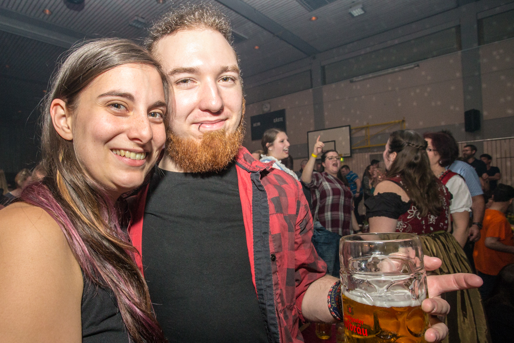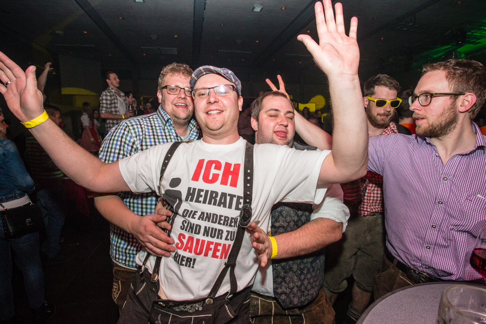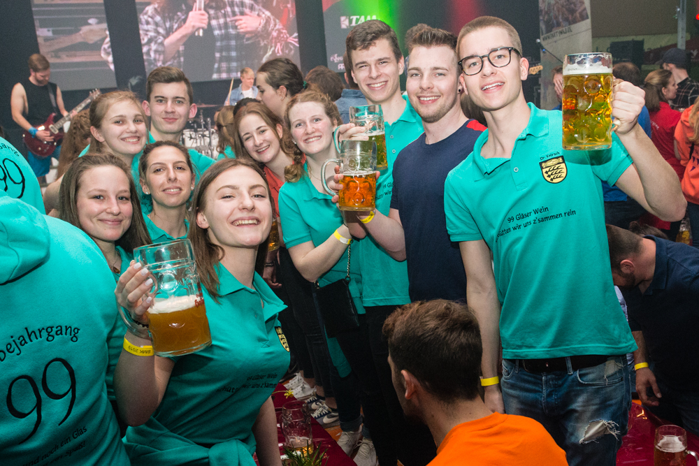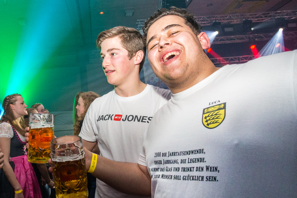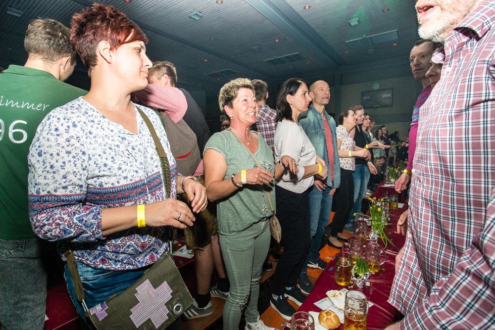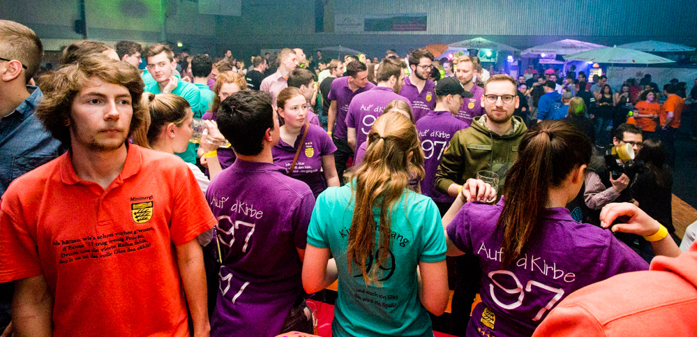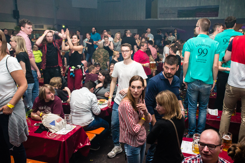 Für die Stimmung in der Halle war heuer die aus Mosbach stammende Partyband Xtreme verantwortlich. Sie hämmerte ihr Repertoire in den Saal, das von Adele bis zu den Toten Hosen reichte, von Bruno Mars über Robbie Williams bis hin zu Wolfgang Petry, Sido, Andreas Bourani, Mark Foster und den Ärzten, ließ Konfetti von der Decke herab auf das Publikum regnen und sorgte mit ihrer rasanten Bühnenshow dafür, dass es die Gäste im Saal nicht auf den Bierbänken hielt. Man hätte schon aus Eichenholz geschnitzt sein müssen, hätte man sich nicht dazu mitreißen lassen, im Lichtergewitter und zu den wummernden Bässen, die schier die Gläser zum Klirren brachten, in den Gängen, auf den Tischen und Bänken zu tanzen. Jung und Alt hatte sich da zu einer ausgelassenen fröhlichen Festgesellschaft zusammengefunden. Aus dem dicksten Trubel ragte der Weinstädter Oberbürgermeister Michael Scharmann heraus, der diese Form des Bads in der Menge sichtlich genoss. Stylisch angesagt waren an diesem Abend Lederhosen, kurz geschnittene Seppelhosen bei den jungen Damen, knielang bei den Herren, dazu Trachtenblusen, rot und blau karierte Schiffschaukelbremserhemden, Dirndlkleider und – wie könnte es anders sein für Beutelsbach – Kirbejahrgangs-T-Shirts. Dieses Outfit bestimmte das Bild.