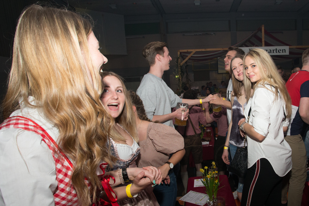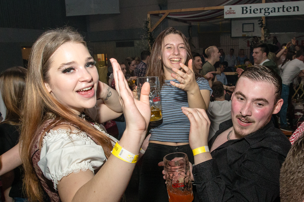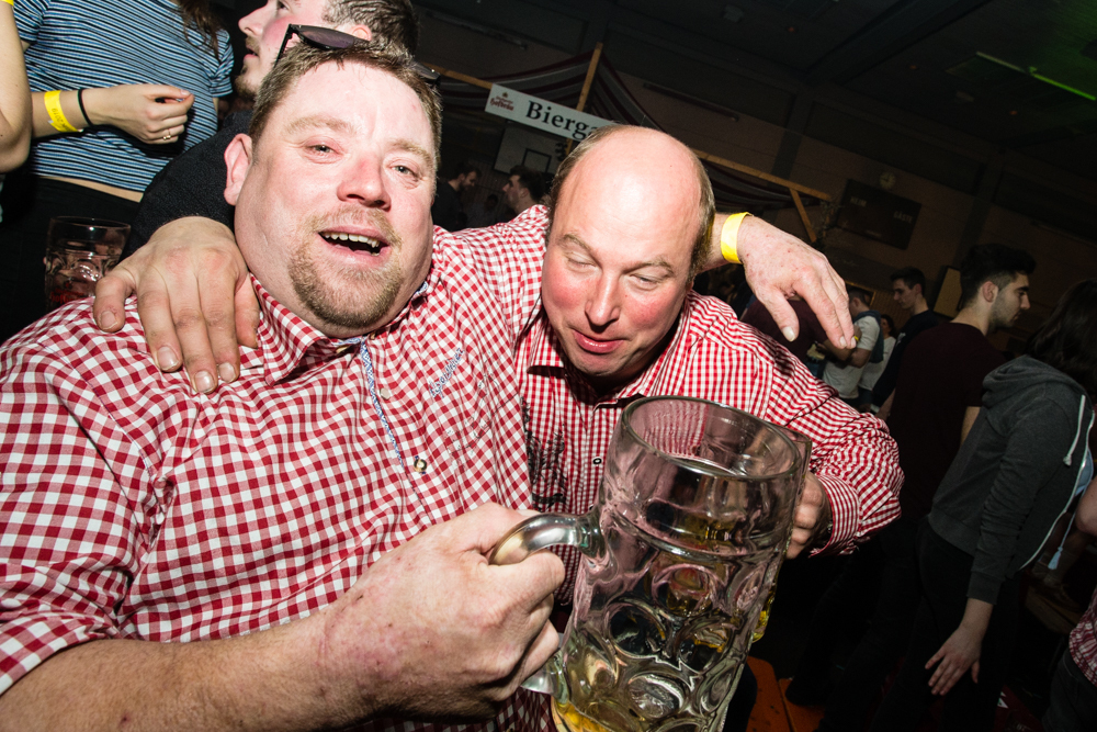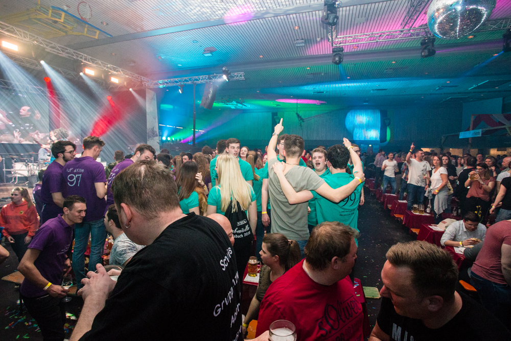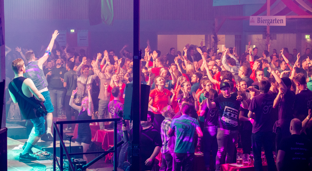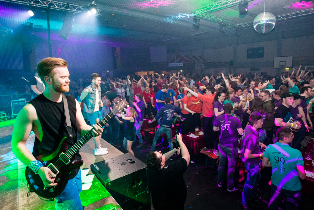 Für die Stimmung in der Halle war heuer die aus Mosbach stammende Partyband Xtreme verantwortlich. Sie hämmerte ihr Repertoire in den Saal, das von Adele bis zu den Toten Hosen reichte, von Bruno Mars über Robbie Williams bis hin zu Wolfgang Petry, Sido, Andreas Bourani, Mark Foster und den Ärzten, ließ Konfetti von der Decke herab auf das Publikum regnen und sorgte mit ihrer rasanten Bühnenshow dafür, dass es die Gäste im Saal nicht auf den Bierbänken hielt. Man hätte schon aus Eichenholz geschnitzt sein müssen, hätte man sich nicht dazu mitreißen lassen, im Lichtergewitter und zu den wummernden Bässen, die schier die Gläser zum Klirren brachten, in den Gängen, auf den Tischen und Bänken zu tanzen. Jung und Alt hatte sich da zu einer ausgelassenen fröhlichen Festgesellschaft zusammengefunden. Aus dem dicksten Trubel ragte der Weinstädter Oberbürgermeister Michael Scharmann heraus, der diese Form des Bads in der Menge sichtlich genoss. Stylisch angesagt waren an diesem Abend Lederhosen, kurz geschnittene Seppelhosen bei den jungen Damen, knielang bei den Herren, dazu Trachtenblusen, rot und blau karierte Schiffschaukelbremserhemden, Dirndlkleider und – wie könnte es anders sein für Beutelsbach – Kirbejahrgangs-T-Shirts. Dieses Outfit bestimmte das Bild.