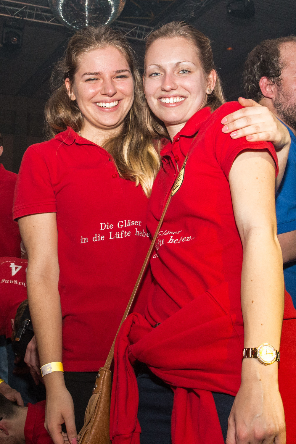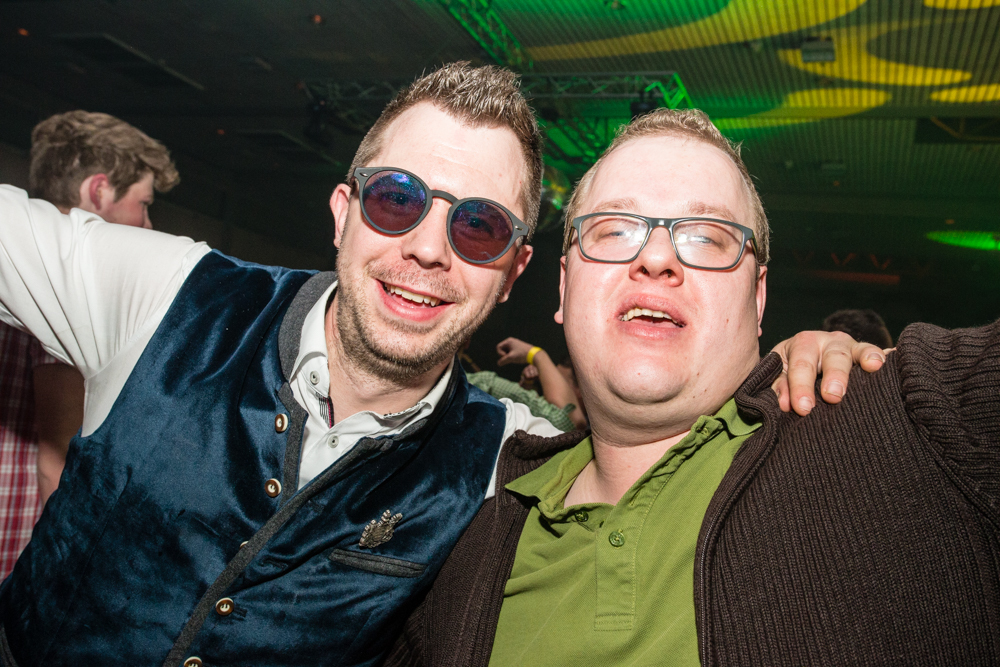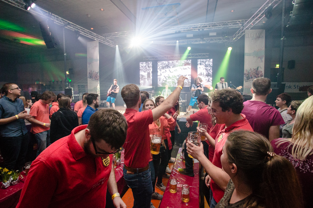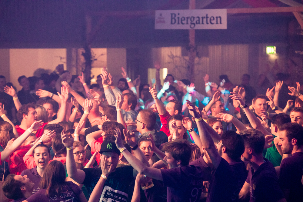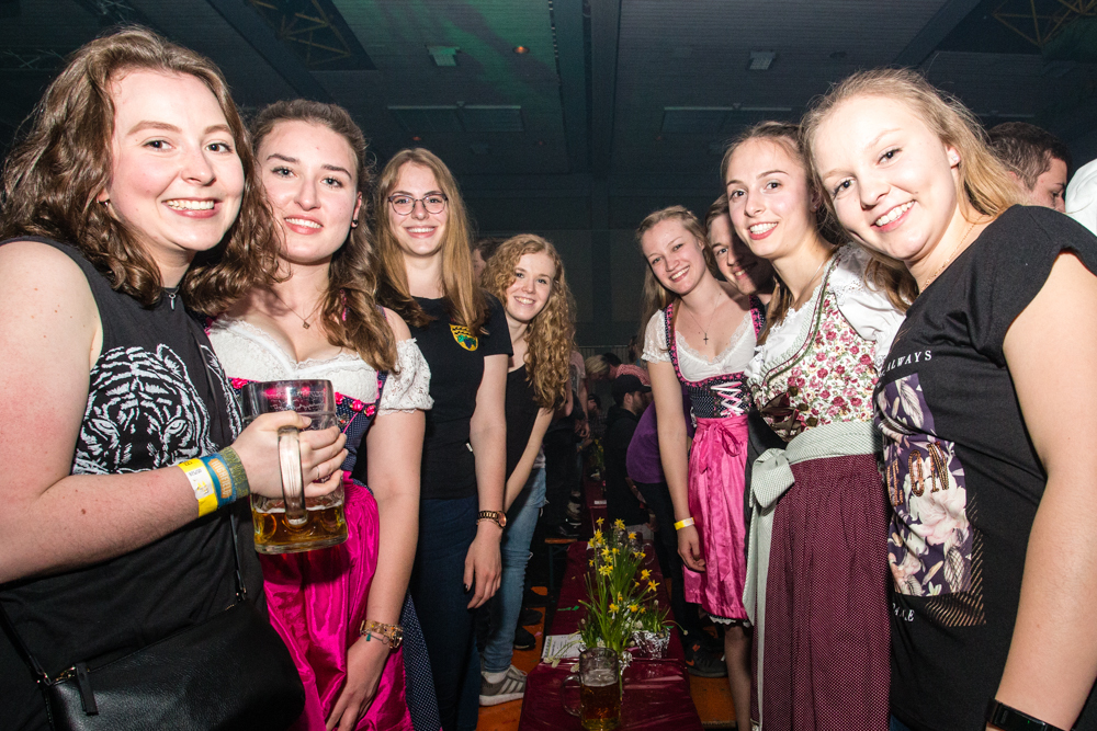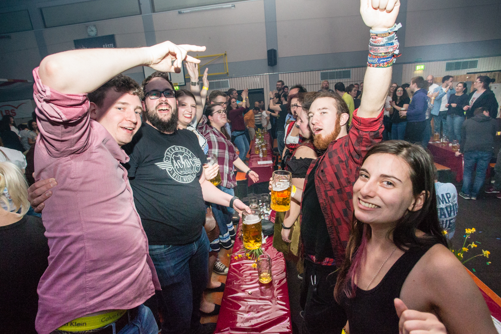 Für die Stimmung in der Halle war heuer die aus Mosbach stammende Partyband Xtreme verantwortlich. Sie hämmerte ihr Repertoire in den Saal, das von Adele bis zu den Toten Hosen reichte, von Bruno Mars über Robbie Williams bis hin zu Wolfgang Petry, Sido, Andreas Bourani, Mark Foster und den Ärzten, ließ Konfetti von der Decke herab auf das Publikum regnen und sorgte mit ihrer rasanten Bühnenshow dafür, dass es die Gäste im Saal nicht auf den Bierbänken hielt. Man hätte schon aus Eichenholz geschnitzt sein müssen, hätte man sich nicht dazu mitreißen lassen, im Lichtergewitter und zu den wummernden Bässen, die schier die Gläser zum Klirren brachten, in den Gängen, auf den Tischen und Bänken zu tanzen. Jung und Alt hatte sich da zu einer ausgelassenen fröhlichen Festgesellschaft zusammengefunden. Aus dem dicksten Trubel ragte der Weinstädter Oberbürgermeister Michael Scharmann heraus, der diese Form des Bads in der Menge sichtlich genoss. Stylisch angesagt waren an diesem Abend Lederhosen, kurz geschnittene Seppelhosen bei den jungen Damen, knielang bei den Herren, dazu Trachtenblusen, rot und blau karierte Schiffschaukelbremserhemden, Dirndlkleider und – wie könnte es anders sein für Beutelsbach – Kirbejahrgangs-T-Shirts. Dieses Outfit bestimmte das Bild.