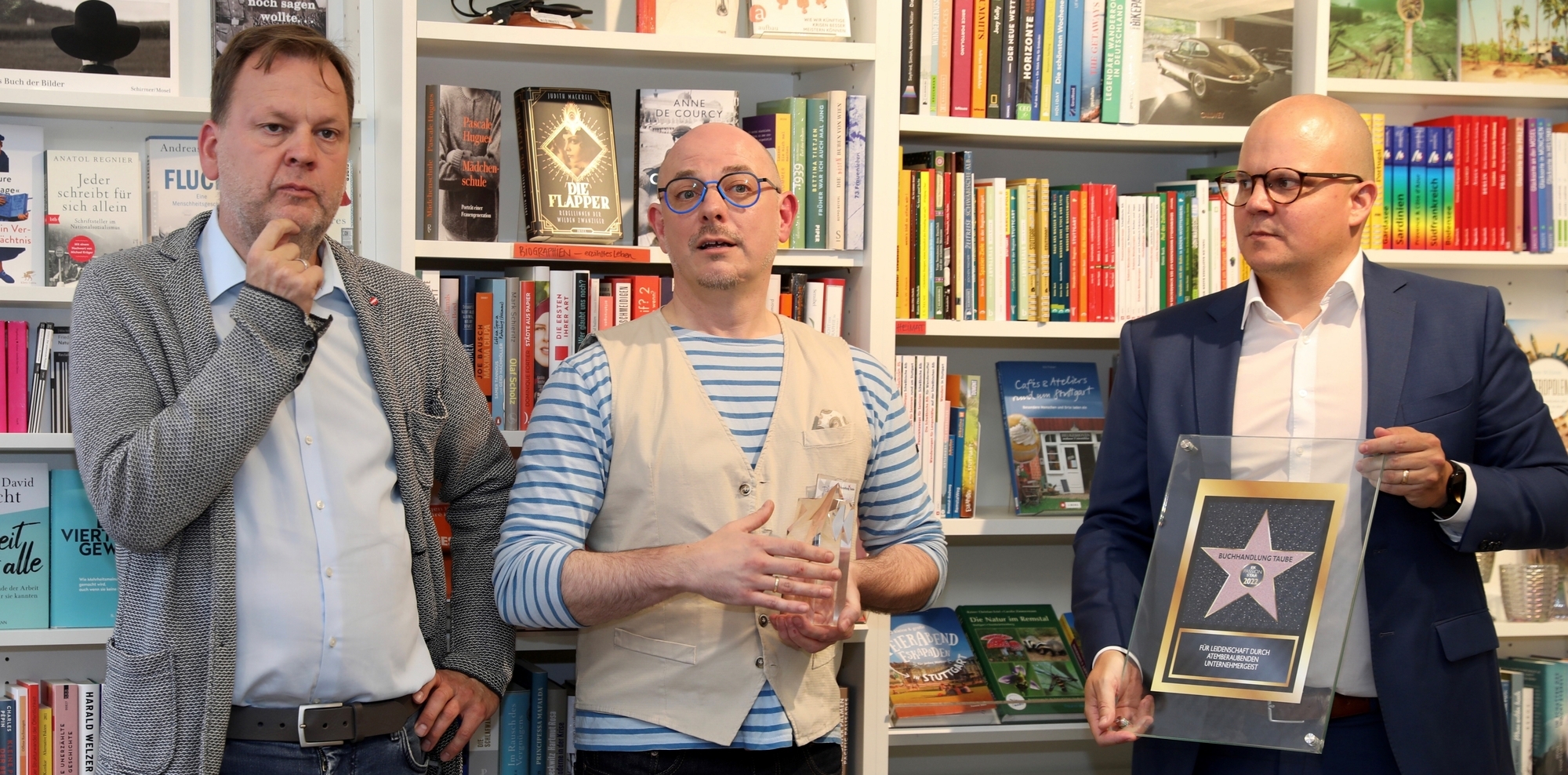 Markus Schneider, der die Buchhandlungen „Taube“ in Marbach und Waiblingen führt, ist mit dem „EK Passion Star 2022“ ausgezeichnet worden, laut Mitteilung „für sein leidenschaftliches Handeln in schwierigen Zeiten“.