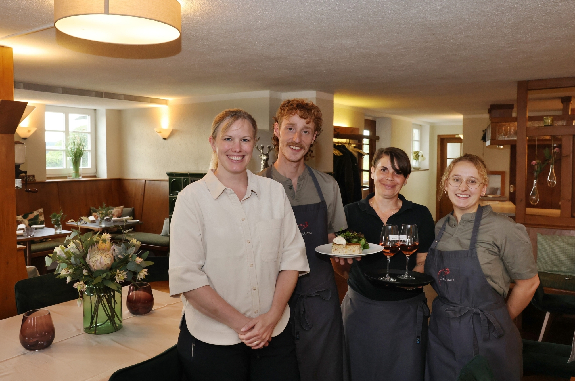 Eine Zeit lang war es still um das frühere „Café Kuhstall“ in Hegnach. Inzwischen ist dort ein Reptil heimisch geworden, mit dem in der Nähe schwäbischer Bauernhöfe keiner rechnet: das „Krokodil im Kuhstall“. Tatsächlich warten Sigrid und Janis Rozkalns und ihr Team mit kulinarischen Überraschungen auf. Statt auf Kaffee und Kuchen setzen sie mit gleich drei gelernten Köchinnen und Köchen auf kreative Küche, die bei moderaten Preisen Erfahrung in der gehobenen Gastronomie verrät.