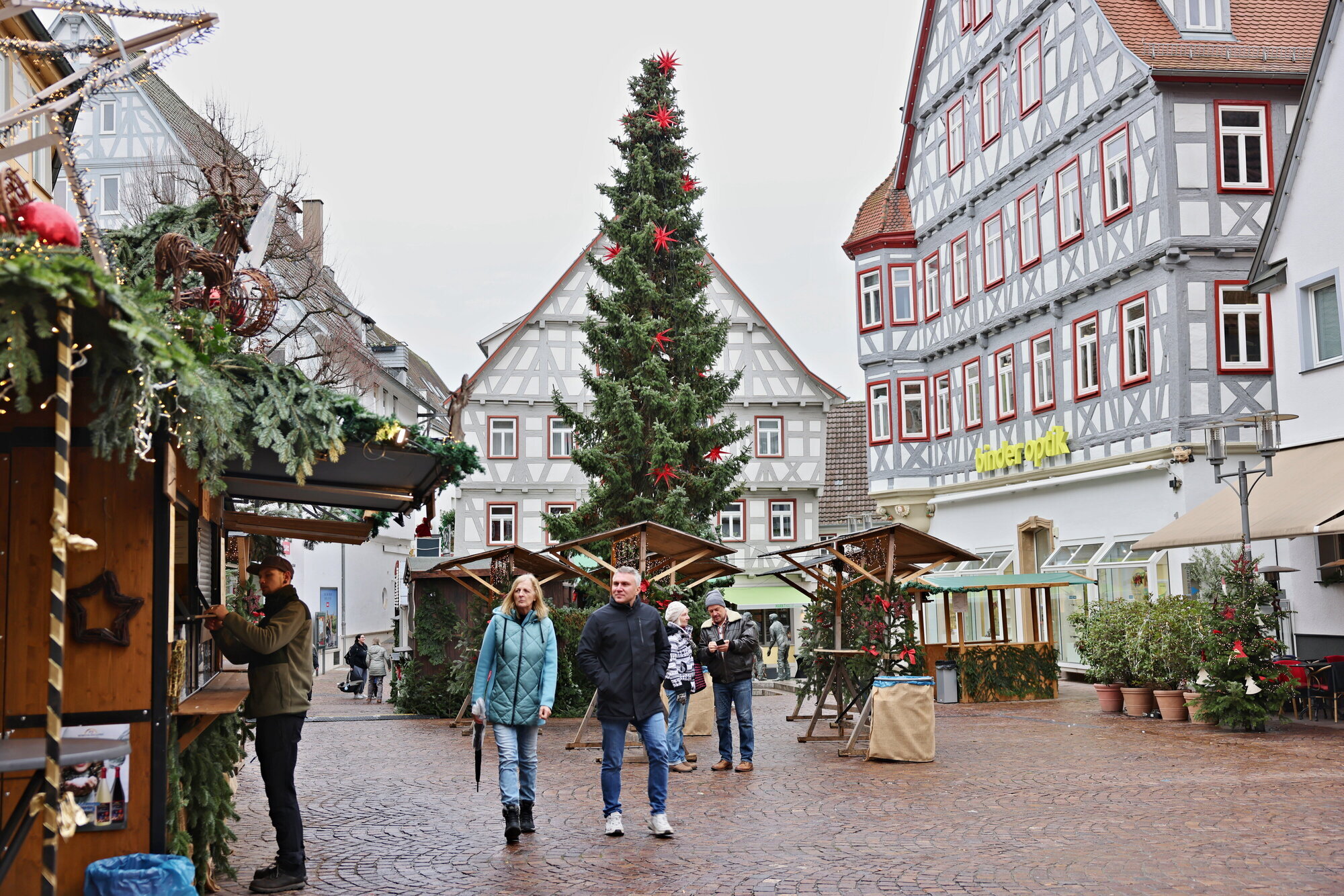Waiblingen. Rote Weihnachtssterne hängen in den Zweigen der Fichte, die mitten auf dem Marktplatz in Waiblingen steht. Der große Baum hat Tradition in Waiblingen und läutet gemeinsam mit dem Weihnachtsmarkt den Beginn der Adventszeit ein. Doch in diesem Jahr ist etwas anders: Der Baum ist schlanker als sonst. Viel schlanker. Ist da etwas schiefgelaufen? Nein, verraten uns die Verantwortlichen. Die Baumgröße hat einen triftigen Grund.