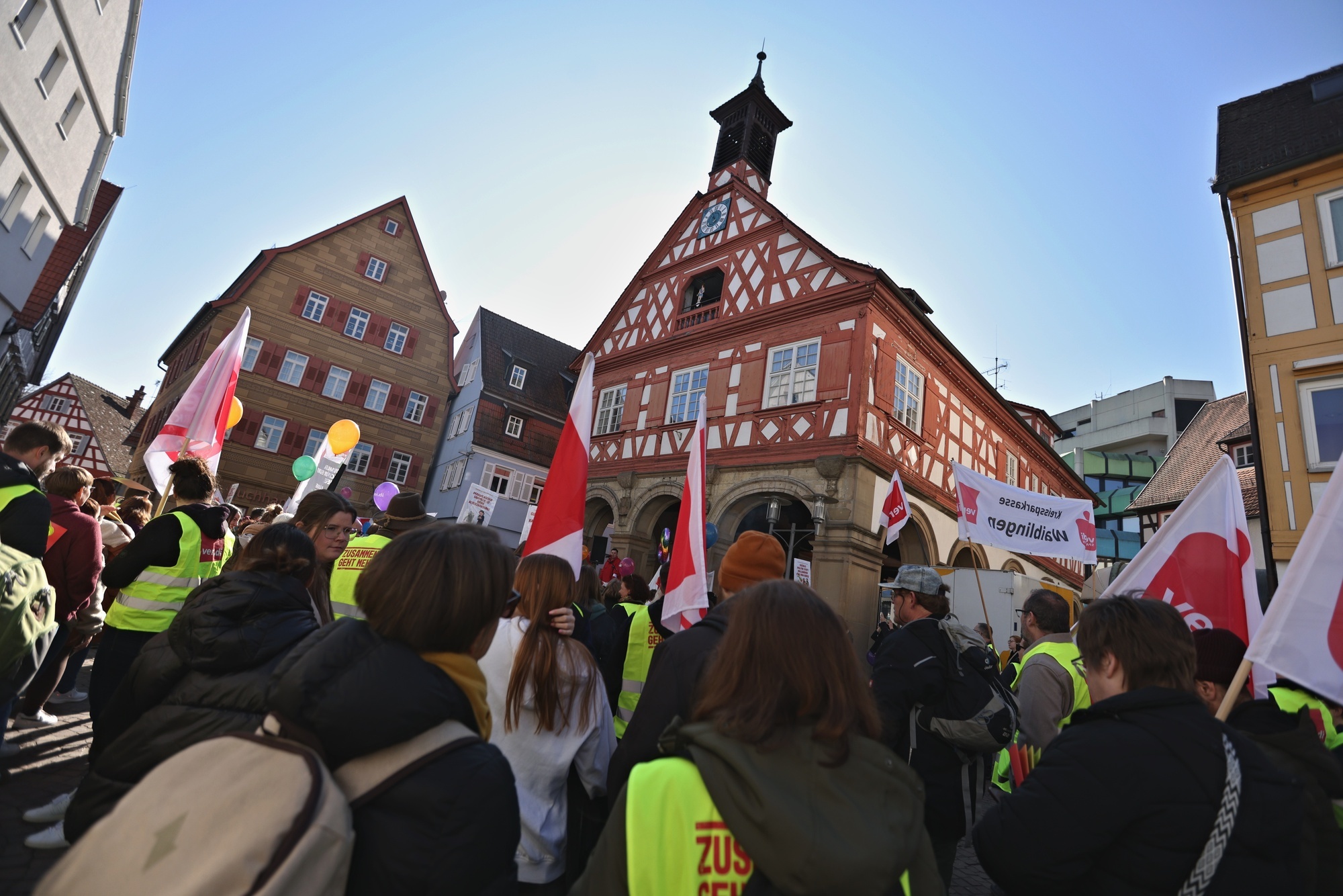 Waiblingen. Unter erhöhten Sicherheitsvorkehrungen hat in der Waiblinger Innenstadt am Donnerstagvormittag (6.3.) eine Demonstration der Gewerkschaft Verdi stattgefunden. Polizei, Ordnungsdienst und vier Betriebshof-Lastwagen sicherten den Demozug ab - Letztere als mobile Bollwerke gegen Amokfahrer. Die Streikenden forderten ein "anständiges" Angebot der Arbeitgeber im Öffentlichen Dienst. Und vor allem auch für Auszubildende ein Gehalt, das für ein eigenständiges Leben