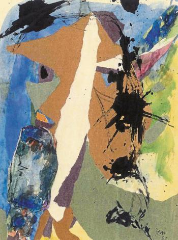 Wobei alles mal klein anfing. 1956 noch, in seiner Collage-Phase, sind die Formate sehr handlich. Er nimmt Papierreste, auch mal Abfallpapier, mit dem er den Lithostein gesäubert hatte, zerriss es und schaute, was ihm dabei der Zufall lieferte. Damit spielte er, ließ sich inspirieren von den Formen und blieb dabei immer figurativ, gegenständlich. Freilich bei hohem Abstraktionsgrad. Wer jetzt vor den großen Stellblöcken der Waiblinger Schau steht und sich nicht sofort ein Bild machen kann, ein Bild von einem Gegenstand, einer Kreatur, einem Menschen, der schaue auf den Titel, der nebendran steht. Jorn mochte es poetisch und anspielungsreich. Wird aber auch konkret. Fast lenkt er unseren Blick. „Junges Mädchen“ heißt es mal, dann „Papiernase“, „Zeitungsmann“, „Unterbrochenes Fest“.