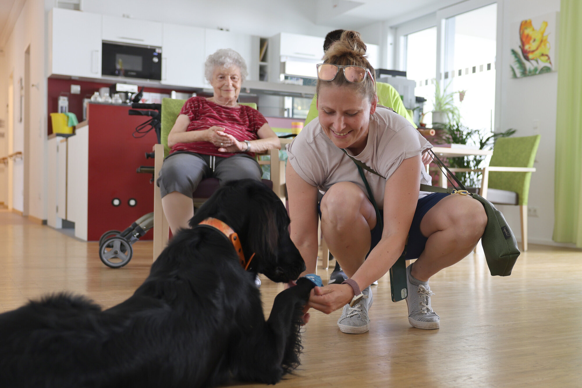 Waiblingen-Beinstein. Einmal im Monat bekommen die Bewohner des DRK-Seniorenzentrums Beinstein besonderen Besuch, einen auf vier Pfoten. Der schwarze Retriever Nemo kommt dann an der Leine von Frauchen Cornelia Mast in die Pflegeeinrichtung in der Remsgartenstraße 10. Für Gurkenscheiben legt er sich bei hohen Sommertemperaturen gerne ins Zeug und zeigt, welche Kunststücke er so darauf hat und gewinnt damit die Herzen der älteren Menschen.