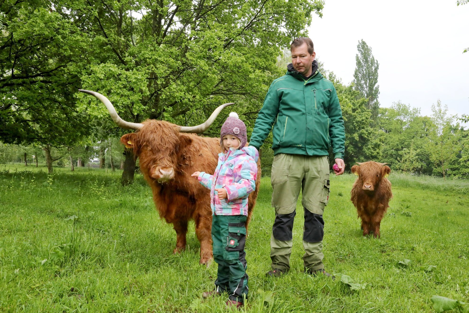 Nur auf den ersten Blick wirkt Lisa ein bisschen gefährlich mit ihren ausladenden Wikinger-Hörnern. Wild und vom Wind zerzaust wie das Gras in den schottischen Highlands hängt das Zottelfell über die treu blickenden Augen. Wenn Besitzer Björn Thoröe und sein Töchterlein Mayla nach ihr rufen, folgt sie prompt, aber ohne Eile.