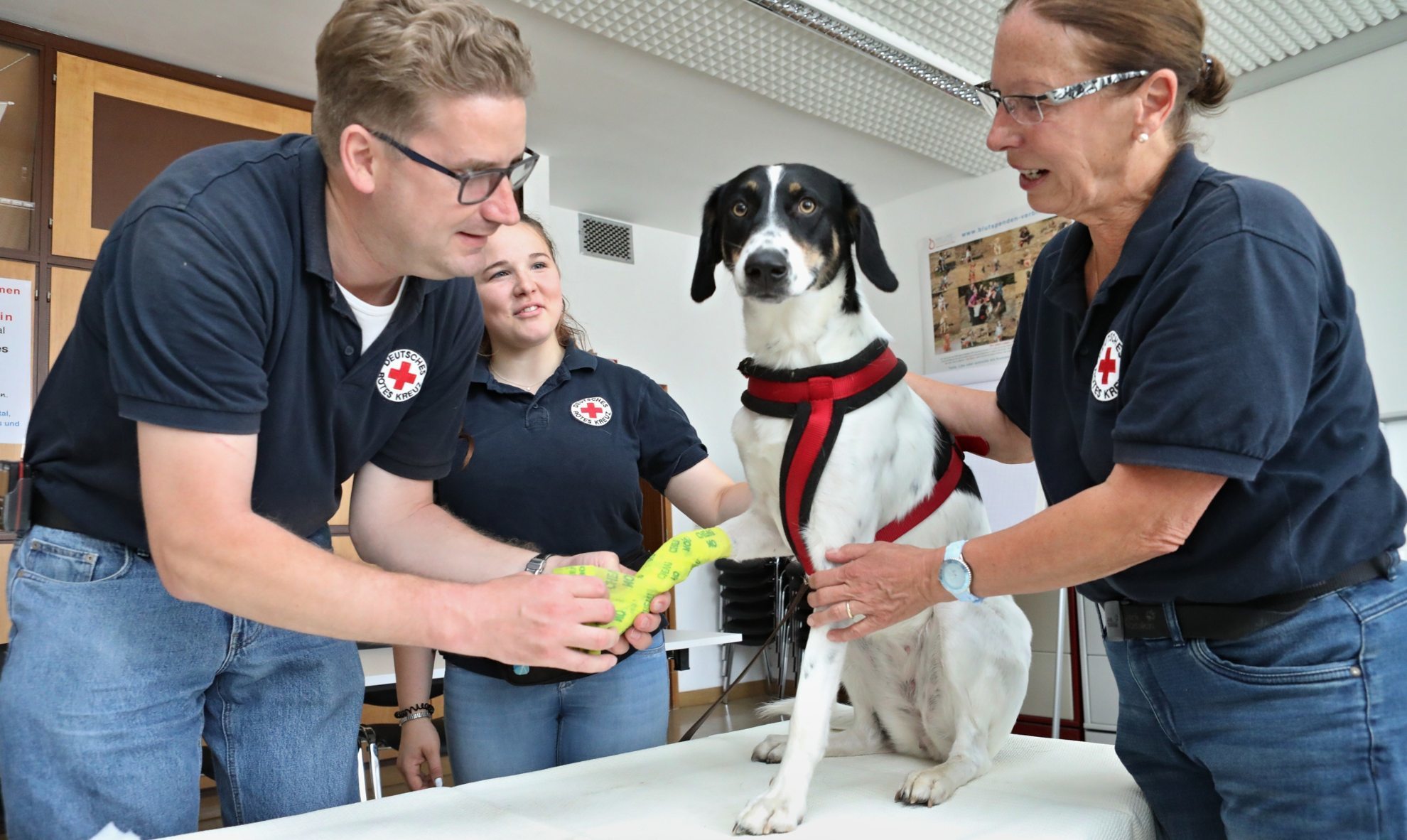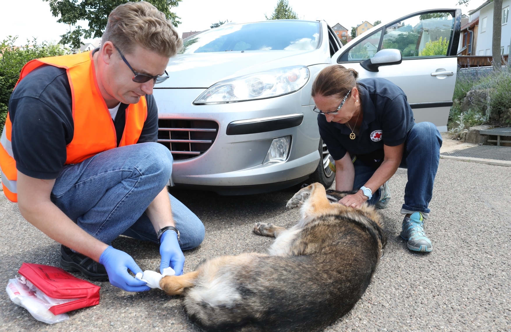 Generell ist es ratsam, „von Anfang an mit dem Hund Gewöhnungsübungen durchzuführen und ihn immer mal wieder zu untersuchen“, sagt Martin Maier vom DRK Kernen. Einerseits hilft das, Veränderungen am Hund zu erkennen, und andererseits gewöhnt er sich an die Berührungen und reagiert im Fall einer Erste-Hilfe-Maßnahme gelassener.