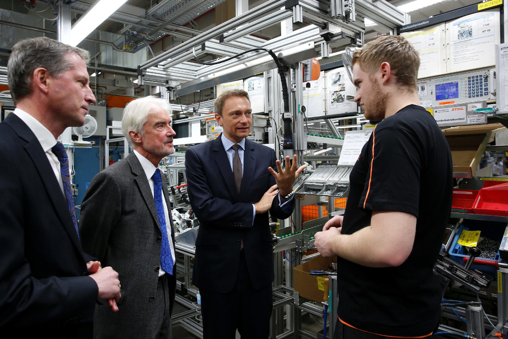 Jochen Haußmann MdL, Prof. Dr. Ulrich Goll MdL, Christian Lindner (Bundesvorsitzender der FDP) und Dustin Jeske im Gespräch im Stihl Werk 2. © Christine Tantschinez
