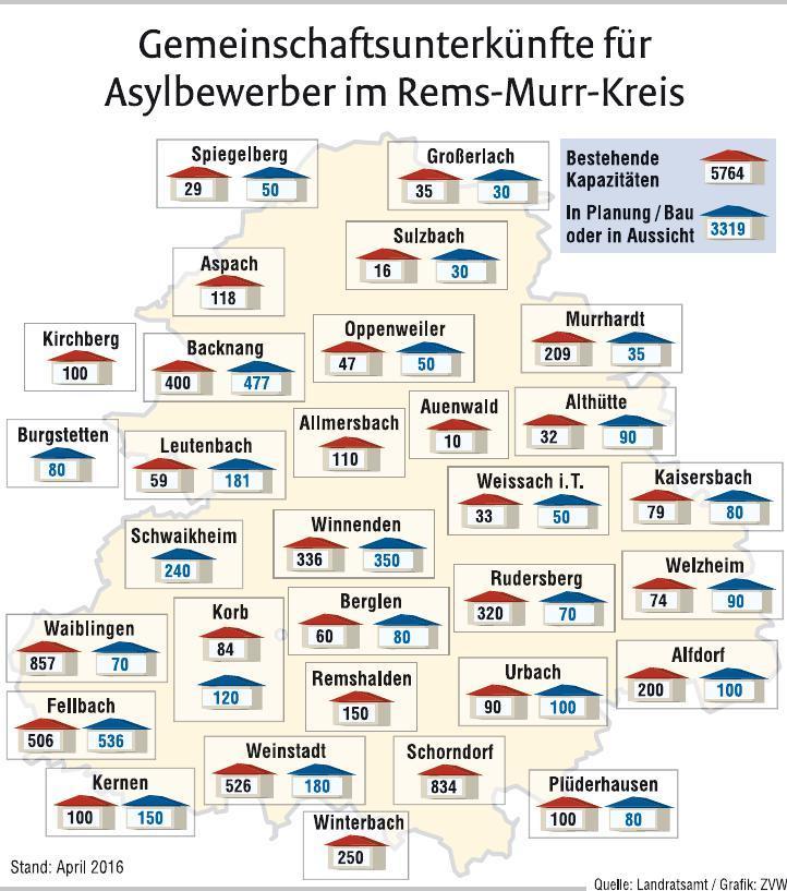Im Rems-Murr-Kreis sind aktuell rund 5300 Flüchtlinge in 64 Gemeinschaftsunterkünften untergebracht. 29 von 31 Gemeinden zwischen Rems und Murr stellen Unterkünfte zur Verfügung. „Das Ziel der Verteilungsgerechtigkeit wird weiter mit Nachdruck verfolgt“, heißt es im Flüchtlingsbericht des Landratsamtes.
