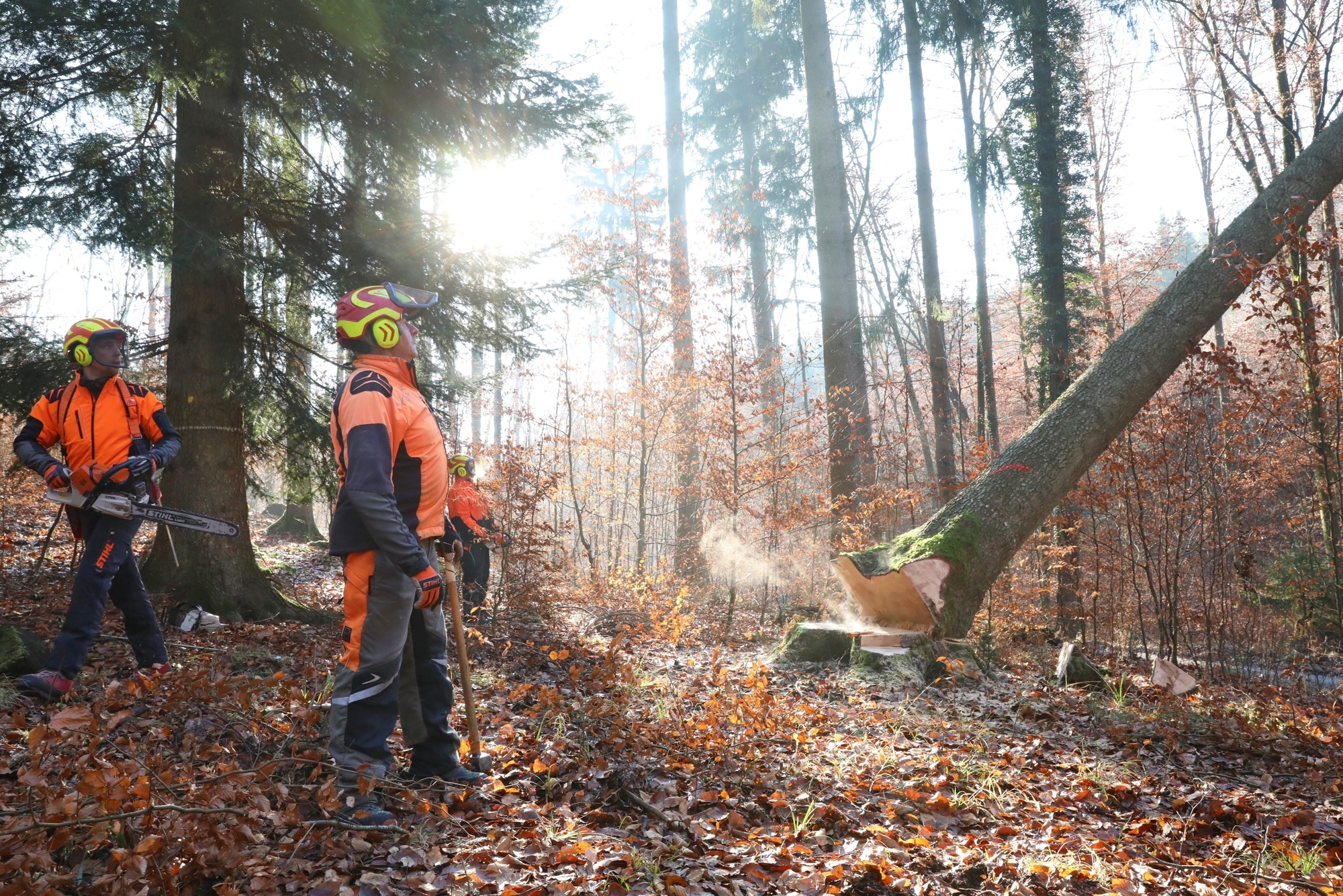 Reif bedeckt das Bodenlaub. In den vereinzelten Pfützen am Wegesrand schwebt eine hauchdünne Eisschicht. Die Forstarbeiter im Waiblinger Stadtwald sind härtere Winter gewohnt. Bei bis zu minus 20 Grad oder bei Schnee haben sie schon draußen gearbeitet. Wenn’s aus Sicherheitsgründen gar nicht mehr ging, gingen sie aufs Arbeitsamt zum Stempeln. Heute gießt die Sonne goldenes Licht zwischen die Baumwipfel. Eine stolze Tanne soll fallen, „bevor der Käfer sie wieder frisst“. Fünf Festmeter gutes