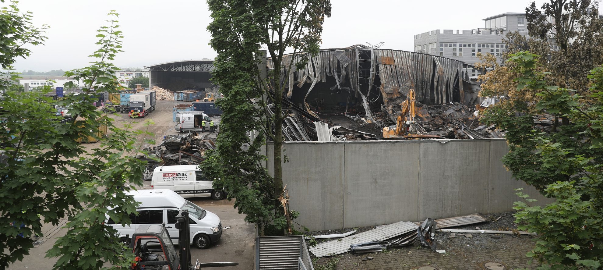 Das hätte sich am vergangenen Mittwoch kaum einer vorstellen können. Wie berichtet, war das Feuer morgens gegen 9.30 Uhr im in der Lagerhalle ausgebrochen, in der Papier, Kunststoffabfälle, Altbatterien und ausgediente Spraydosen gelagert waren. Feuerwehr, Rettungsdienst sowie Polizei waren im Großeinsatz, das Eisental wurde großräumig gesperrt. Wegen des Feuers stürzte die Hallendecke ein. Die Feuerwehr entschloss sich später dazu, die Halle kontrolliert abbrennen zu lassen. Aufgrund der starken Rauchentwicklung mussten Türen und Fenster im erweiterten Umkreis geschlossen werden.