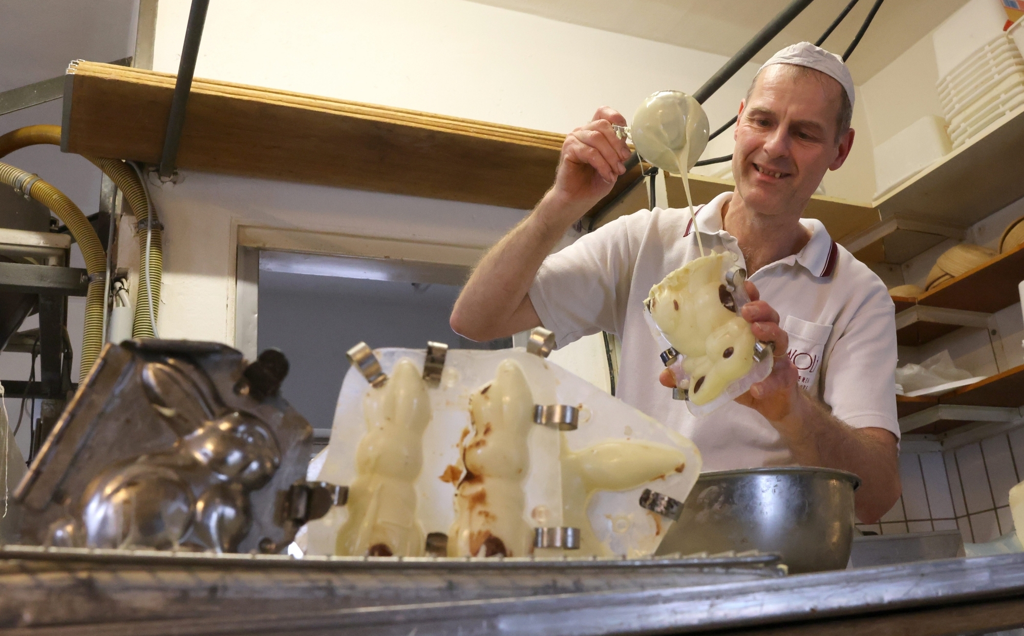 Wer die Schokohasen und Ostereier so handwerklich herstellen will wie Bäcker Andreas Wolf aus Waiblingen, darf nicht arg viel kleiner sein als 1,87 Meter: Denn der Bäckermeister stellt die flüssige Schokolade zum Temperieren gern auf den noch restwarmen Brotofen, wofür er sich ganz schön strecken muss. Auch sonst ist seine Osterproduktion reine Handarbeit: Er gießt die Schokolade in Formen aus Kunststoff oder Blech - die für die früher noch beliebteren Zuckerhasen sind schon fast historische