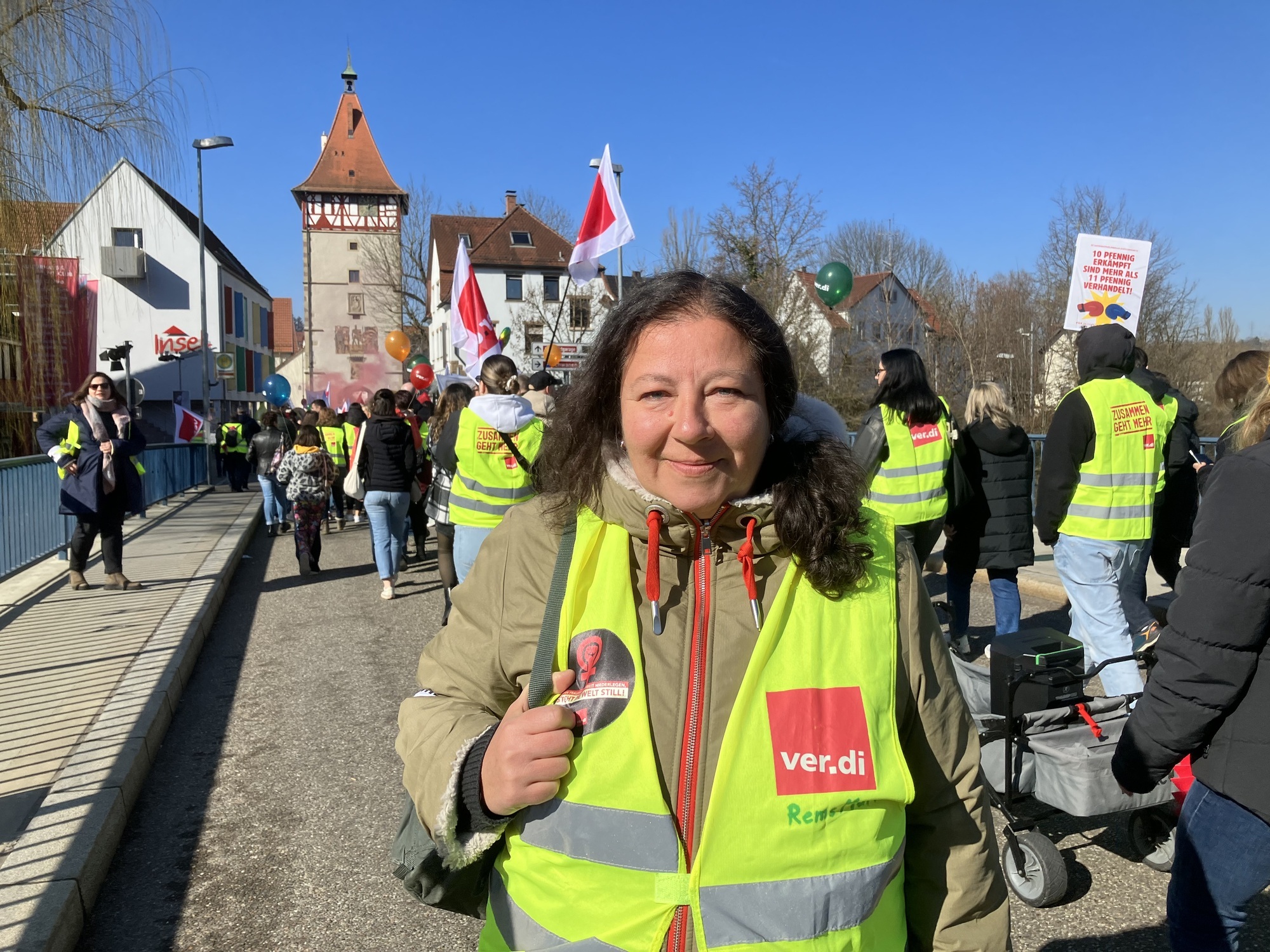 Waiblingen. Dass die Warnstreiks für Kita-Eltern belastend sind, weiß Monika Fiebig natürlich. Sie selbst war als Mutter ja auch schon in der Situation, schnell eine Notbetreuung organisieren oder zu Hause bleiben zu müssen. Trotzdem müsse man streiken, um Druck aufzubauen, so die langjährige Erzieherin am Rande der Verdi-Demo in Waiblingen. Es mache die Kollegen "mürbe", wenn sie dem eigenen pädagogischen Anspruch nicht gerecht werden könnten, weil der Kita-Alltag so