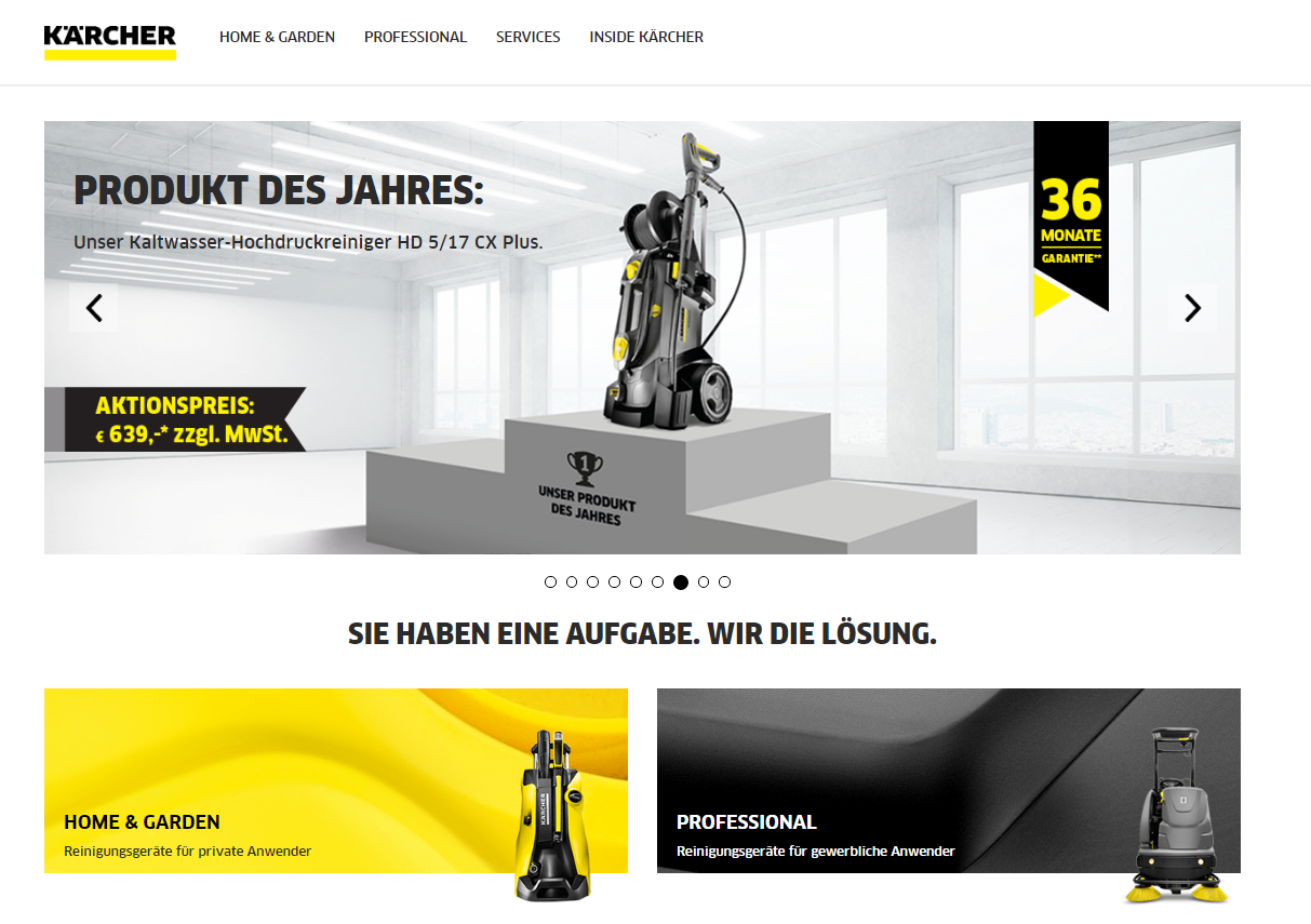 Recht bodenständig tritt der Reinigungsspezialist Kärcher auf. Mit einer kleinen Einschränkung. Kärcher unterscheidet sein Sortiment in „Home & Garden“ und „Professional“. Private Anwender der Reinigungsgeräte würden sich womöglich auch bei „Heim & Garten“ wiederfinden und gewerbliche Anwender bei „Gewerbe“. Zugegeben: „Professional“ klingt professioneller. Aus der Sicht des sprachlichen Reinheitsgebotes hätte Kärcher im weiteren Internetauftritt durchaus noch Reinigungsbedarf und könnte mal seine Rubriken „Inside Kärcher“ und „Newsroom“ durchkärchern.