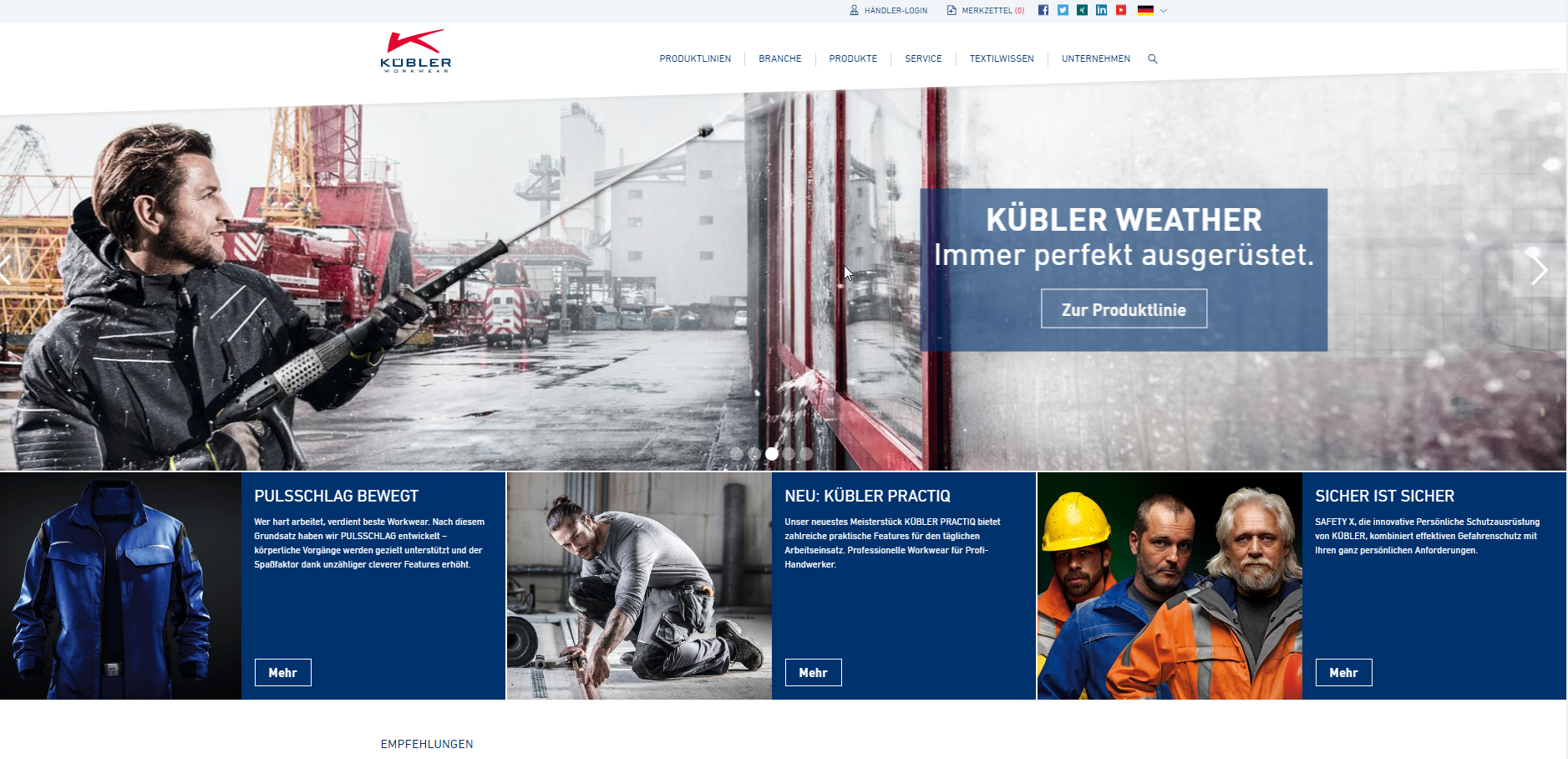 Was klingt besser: Arbeitskleidung oder Workwear? Eben. Der Plüderhäuser Spezialist für Arbeitskleidung firmiert unter Kübler Workwear und hat mehrere Produktlinien, darunter auch „Kübler Weather“. Damit ist aber auch fast schon genug der Anglizismen auf der Internetseite. Vermutlich hätte eine hippere Werbeagentur die extremen Einsatzbedingungen zu „extreme operating conditions“ gepimpt und statt von Kälte, Nässe, Wind und Dunkelheit von coldness, wetness, wind and darkness geschrieben.