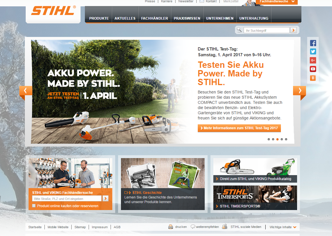 Die Stihl-Gruppe macht 90 Prozent ihres Umsatzes im Ausland. Doch das Bekenntnis zum Standort Waiblingen beweist der Motorsägen- und Gerätehersteller Stihl auch mit dem deutschen Internetauftritt, der sich des Englischen weitgehend enthält – bis auf eine Ausnahme: „Testen Sie Akku Power. Made by Stihl“ schreit uns Stihl auf Englisch die geballte Kraft des Akkumulators entgegen. Gefallen hat uns „Vrrääähm!“ für den großen Sägespaß zum kleinen Preis. Einem Sprachpurist würde bei dem Comicausdruck vermutlich ein „Umpf“ entfleuchen, vielleicht aber auch ein „AI, AAIIEE, AAAAIIIIEEE!“