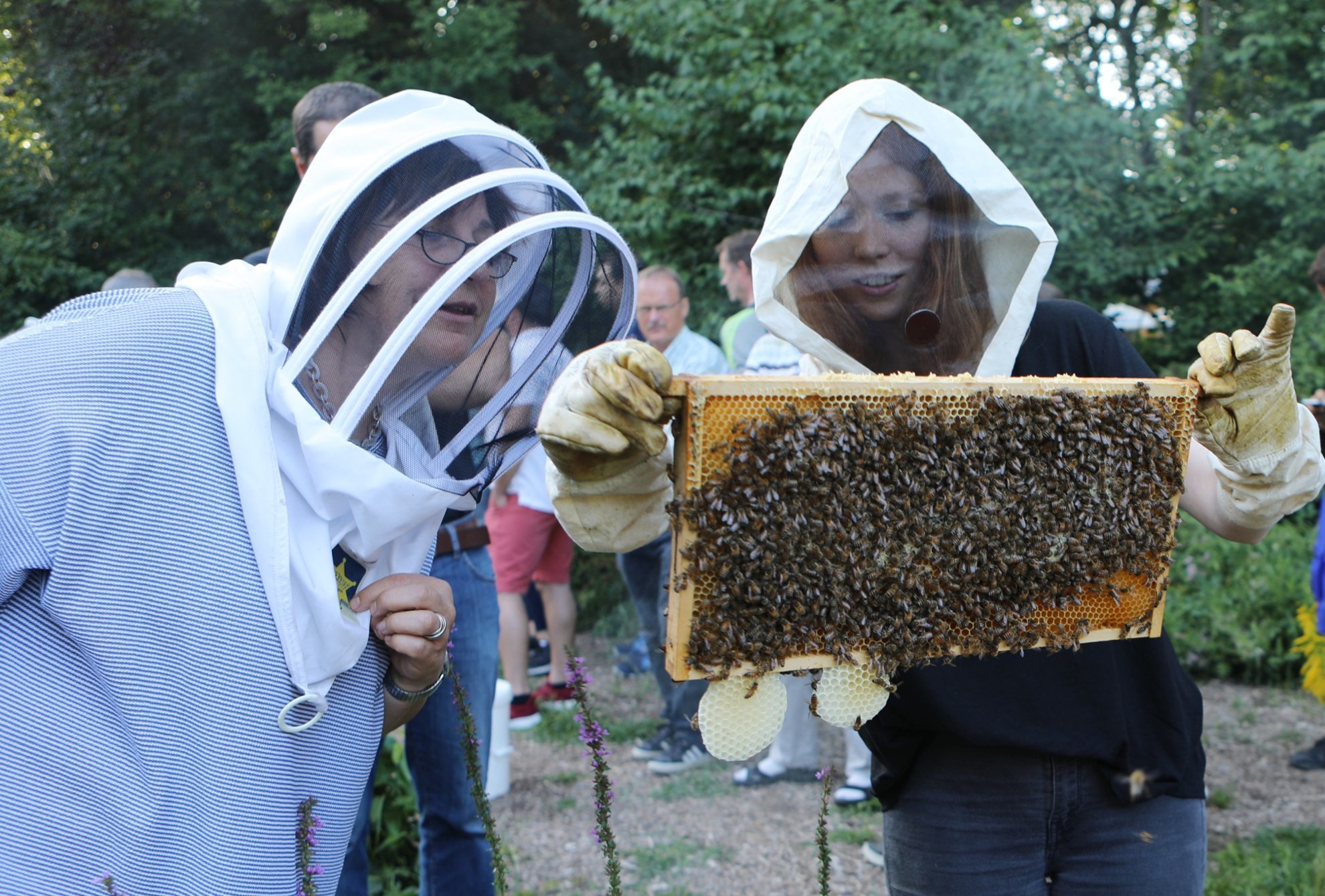 Beim Alvarium, dem Bieneninformationshaus neben dem Hallenbad, duftet’s wie bei einem Grillabend. Doch die Rauchschwaden entstammen keinem Holzkohlegrill, sondern den für die Imkerei typischen „Smokern“, die ein bisschen aussehen wie rustikale Teekannen. Der Qualm soll die Bienen ablenken und die Gefahr von Stichen senken, denn an diesem lauen Sommerabend wollen die Teilnehmer des Neuimkerkurses unter Anleitung erfahrener Mitglieder wie Jens Matthis in den Bienenstöcken nachschauen, wie die Behandlung gegen die Varroamilbe angeschlagen hat. Zuletzt wurde mit Ameisensäuren gegen den bedrohlichsten aller Schädlinge vorgegangen – mit Erfolg. Wo die Milbe sich eingenistet hatte, ist sie offenbar abgestorben.