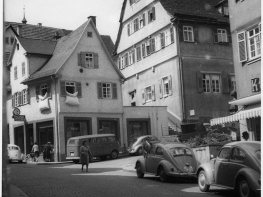 Heute ist der VW-Käfer aus dem Straßenbild verschwunden. Höchstens Oldtimer-Freaks sorgen manchmal noch für die eine oder andere Ausnahme. In den fünfziger Jahren jedoch dominierte er den deutschen Automarkt und wurde als Fahrzeug für die Massen und als Exportschlager zum Symbol des Wirtschaftswunders. 1955 lief in Wolfsburg unter Mediengetöse das millionste Exemplar vom Band. Wahrscheinlich eignete er sich, rund und kompakt wie er eben war, auch gut für die engen Straßen der Waiblinger Altstadt. Gut 60 Jahre später hingegen tendiert mancher Zeitgenosse selbst bei der Fahrt zum Bäcker zum SUV. Um der Vorherrschaft der Automobile den Weg zu ebnen, wurden die Straßen nach Möglichkeit breiter. Wohlgemerkt nicht an der Stelle, an der unser heutiges Zeitreise-Rätselbild aufgenommen wurde. Geparkt wird heute ganz in der Nähe des Fotografen-Standorts – und zwar massenhaft auf mehreren Etagen.