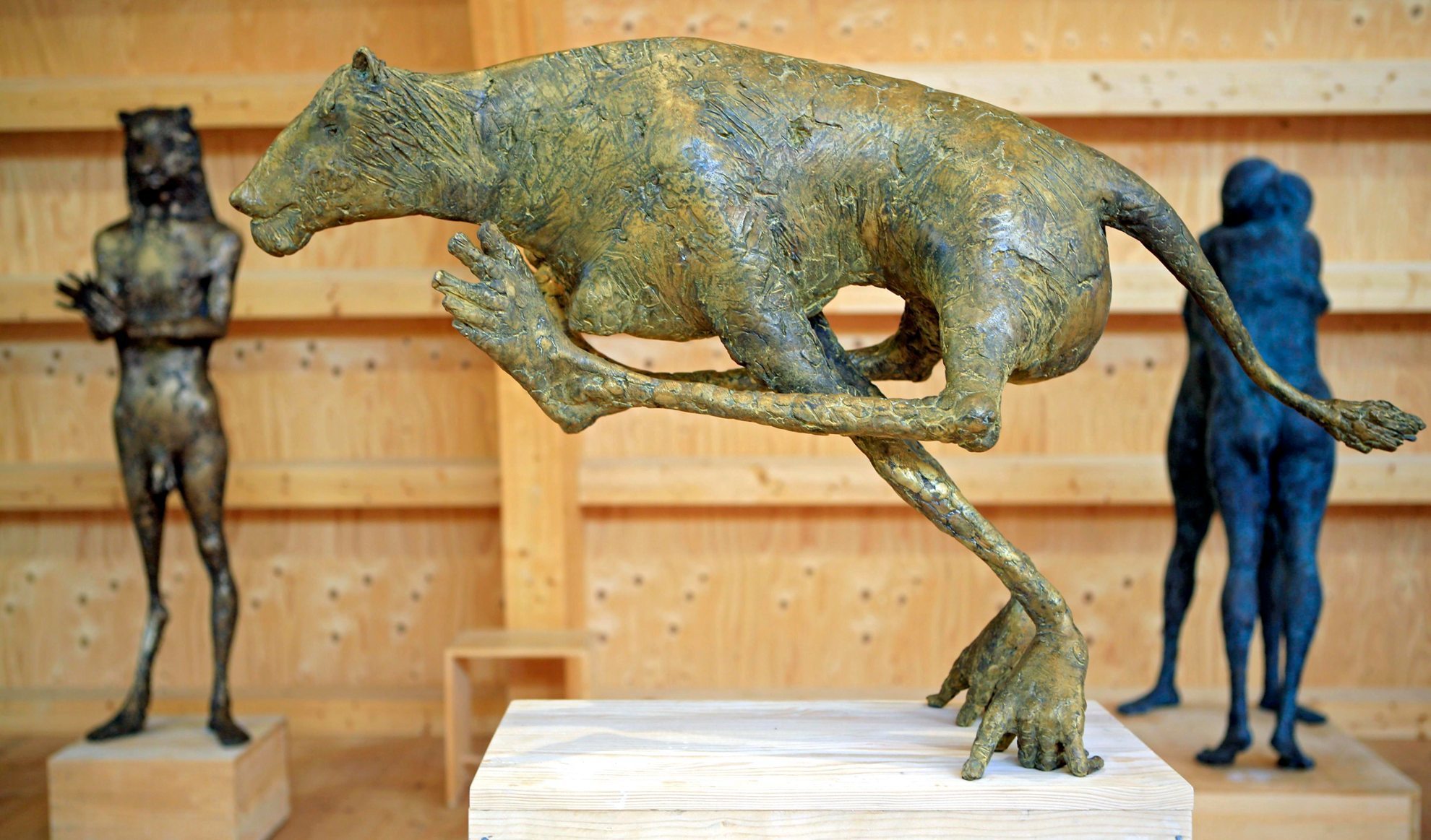Alle seine Skulpturen sind auf Holzkästen gestellt. Darunter Rollen, frei schwenkbar. Wir sehen: zwei Frauen in inniger Vereinigung. Verschmolzen, nicht nur, weil Bronze Hitze braucht. Er holt aus, dreht die Doppelfigur um: Wir sehen Mann und Mann, ebenfalls inniglich und wie ein Schöpfergott sie schuf.