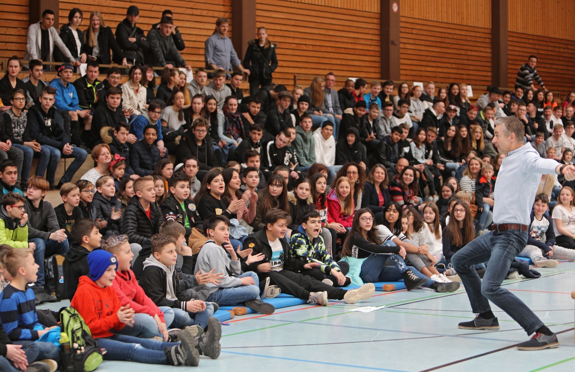 Auch bei der Arbeit und beim Lernen verleiht er neue Kraft. Dabei ist Humor nach Überzeugung des Comedians keine Fähigkeit, die einem durch Schicksal zur Verfügung steht oder nicht, sondern: Man kann ihn trainieren, man muss sogar. Wie das Spielen auf einer Gitarre oder auf einem Keyboard will er geübt werden – am besten täglich. Weil das nicht nur für Schüler gilt, folgte auf den Vortrag in der Sporthalle am Nachmittag ein Workshop für die Lehrer.