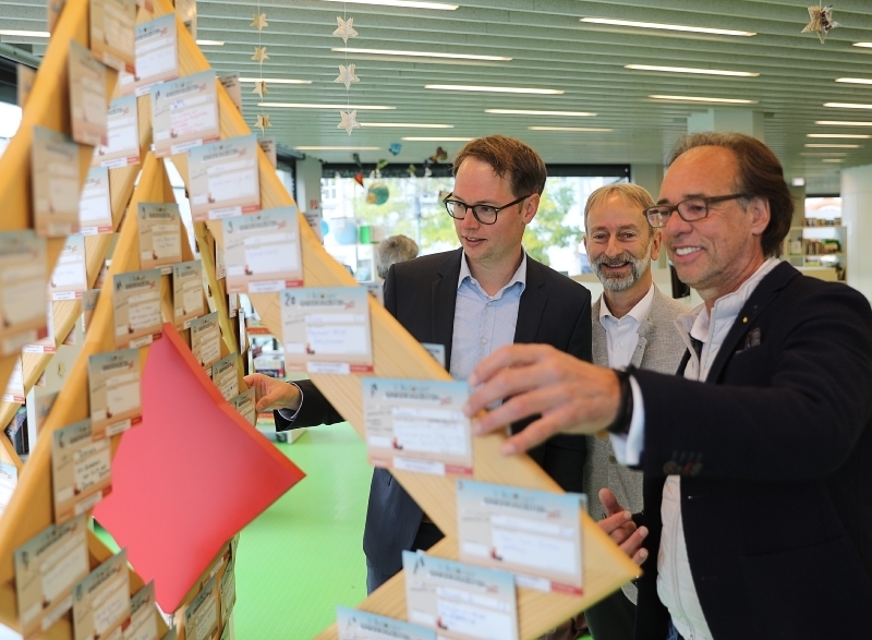 Der Holzstern steht nun wieder in der Stadtbücherei Waiblingen. Daran befinden sich Karten, auf denen Kinder aus finanziell benachteiligten Familien Geschenkwünsche geschrieben haben. Bürgerinnen und Bürger können bis 3. Dezember einen oder mehrere Zettel nehmen und die