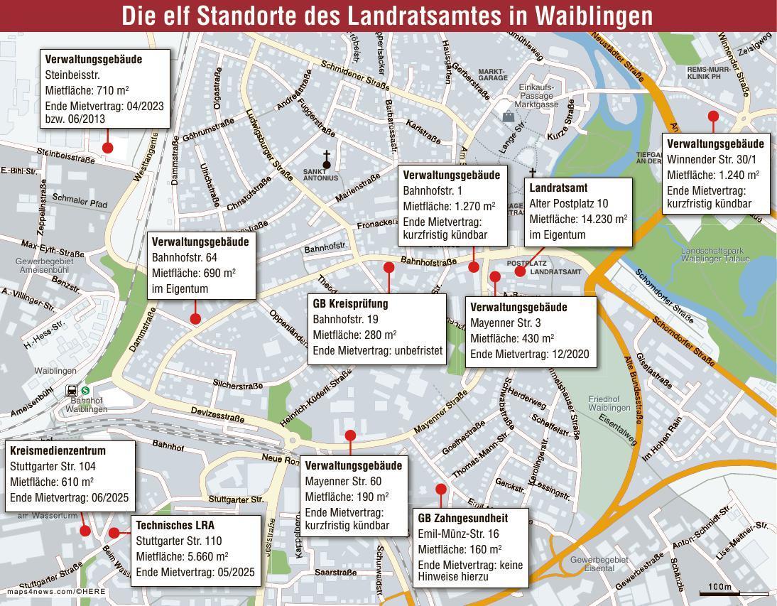 An den elf Standorten in Waiblingen sind aktuell rund 820 Mitarbeiter tätig. Die Gebäude am Alten Postplatz und in der Bahnhofstraße 64 sind im Eigentum des Kreises, die übrigen Liegenschaften sind angemietet. Das Landratsamt braucht eigenen Angaben zufolge dringend weitere Büroflächen.
