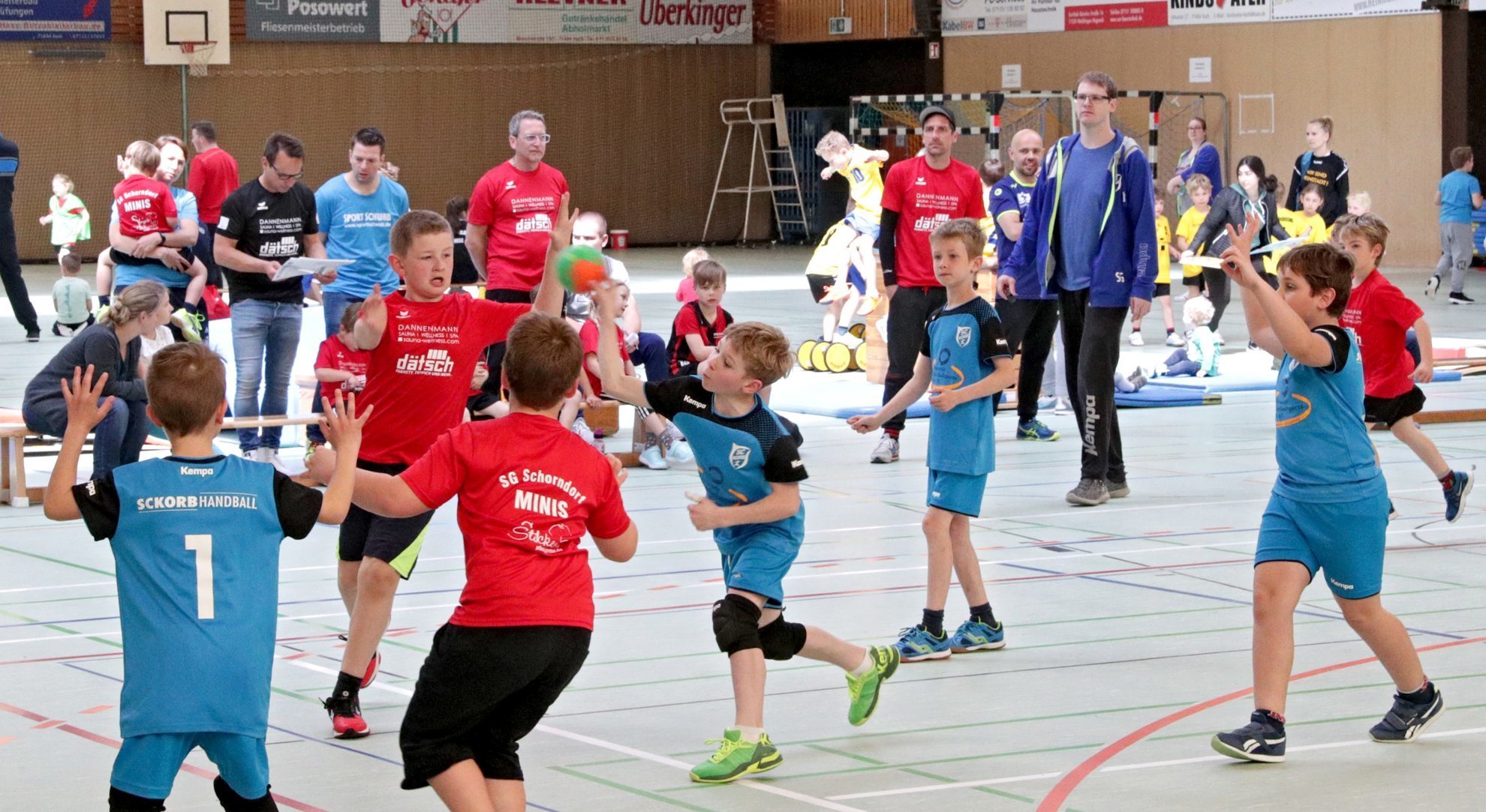 Zu Beginn der Saison haben 17 Minis in die E-Jugend gewechselt – ein starker Jahrgang mit vier Mannschaften, sagt Häußermann: „Die sind heiß auf Handball.“ Das werde auch bei Mini-Spielfesten deutlich, bei denen die Kinder zeigen können, was sie im Training gelernt haben. Für das jüngste Mini-Spielfest der Handball-Abteilung des SC Korb hatten sich 13 Mannschaften angemeldet. Zwei Spielfelder standen für die rund 100 Kinder zur Verfügung, die vier Stunden lang durch die Ballspielhalle flitzten. Auf einem Feld spielten die Minis Handball, auf dem anderen „Funino“. Das ist eine Ballsportart, bei der ebenfalls Tore erzielt werden müssen. Die Schwierigkeit: Nach jedem Punkt werden die Torwarte getauscht, so dass es zu einem ständigen Wechsel auf dem Spielfeld kommt.
