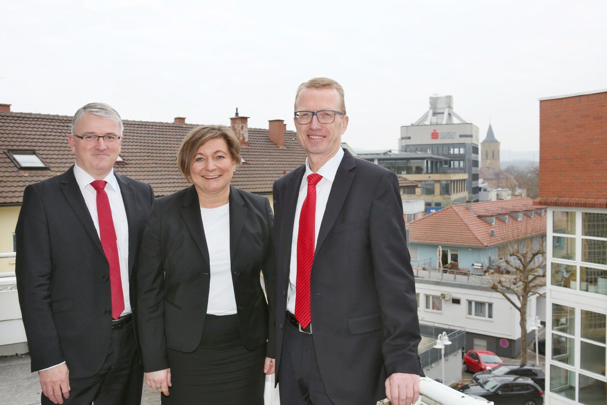 Der dreiköpfige Vorstand der Kreissparkasse Waiblingen vor dem Turm der Sparkasse, der derzeit für 8,5 Millionen Euro grundlegend saniert wird (von links nach rechts: Ralph Walter, Ines Dietze und Interimsvorsitzender Lothar Kümmerle). © Habermann / ZVW