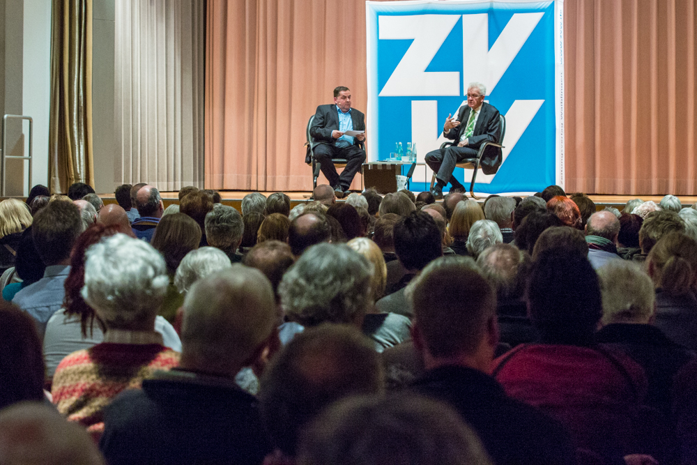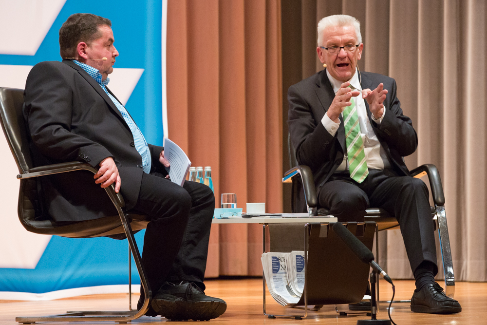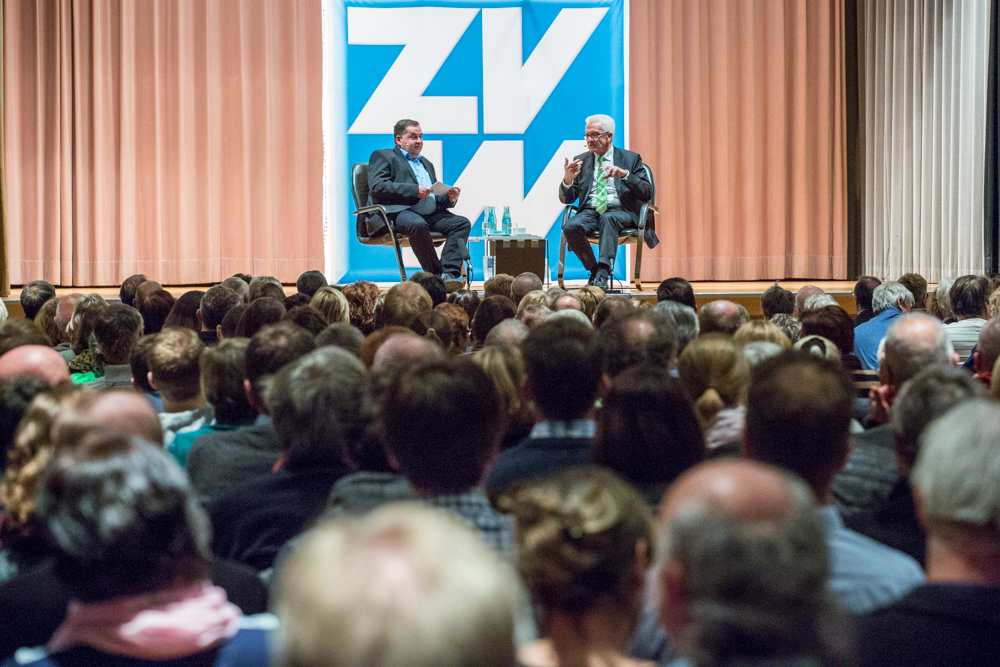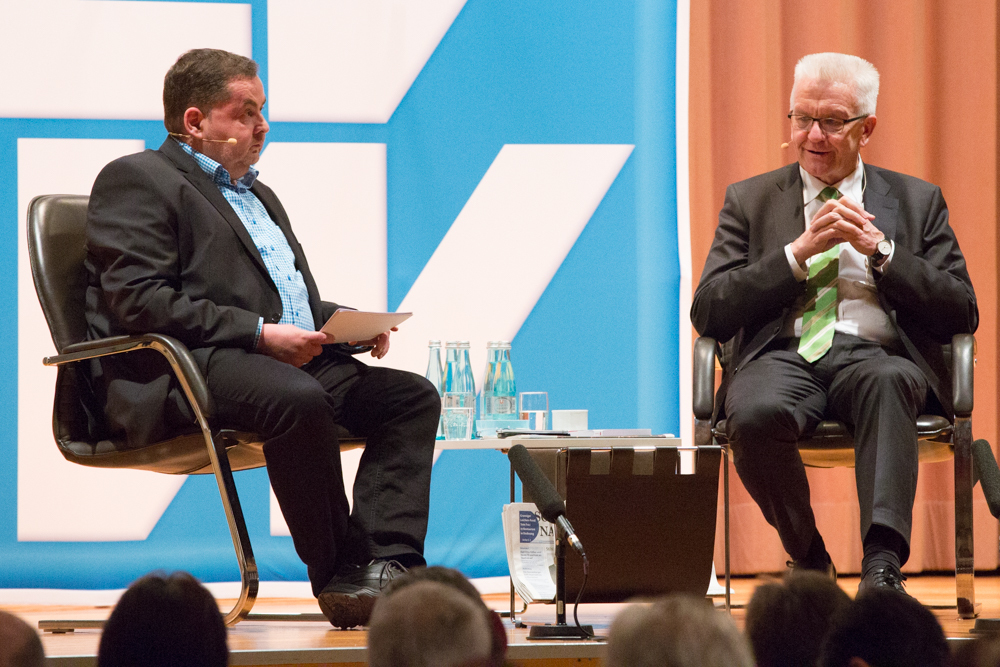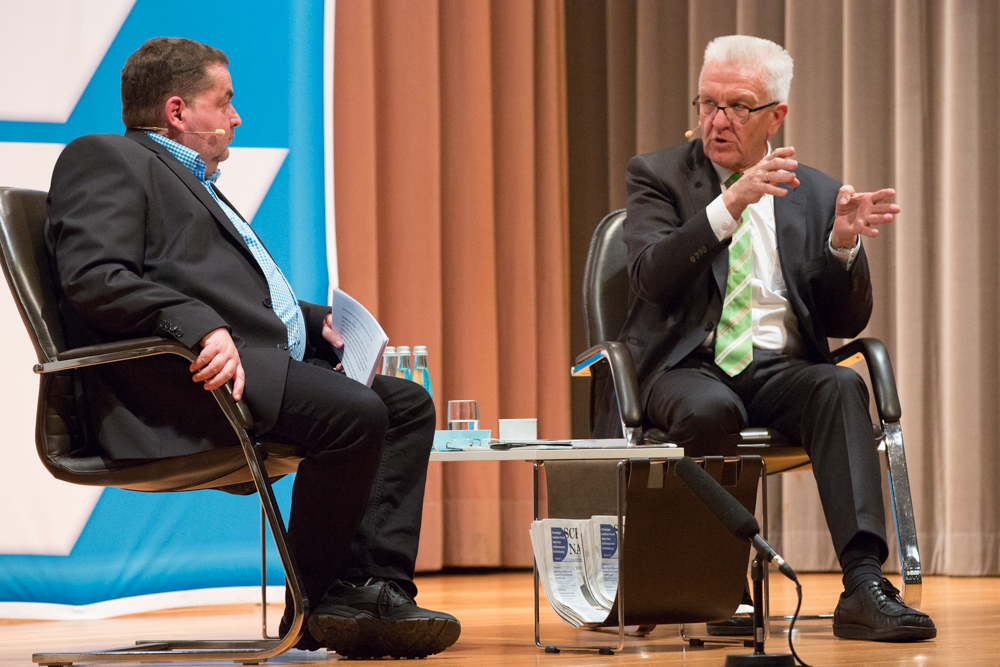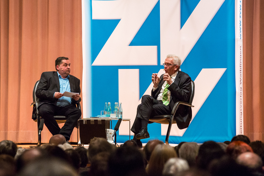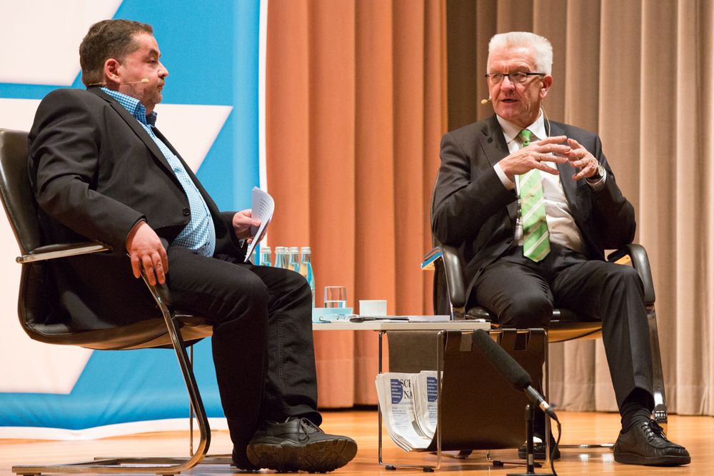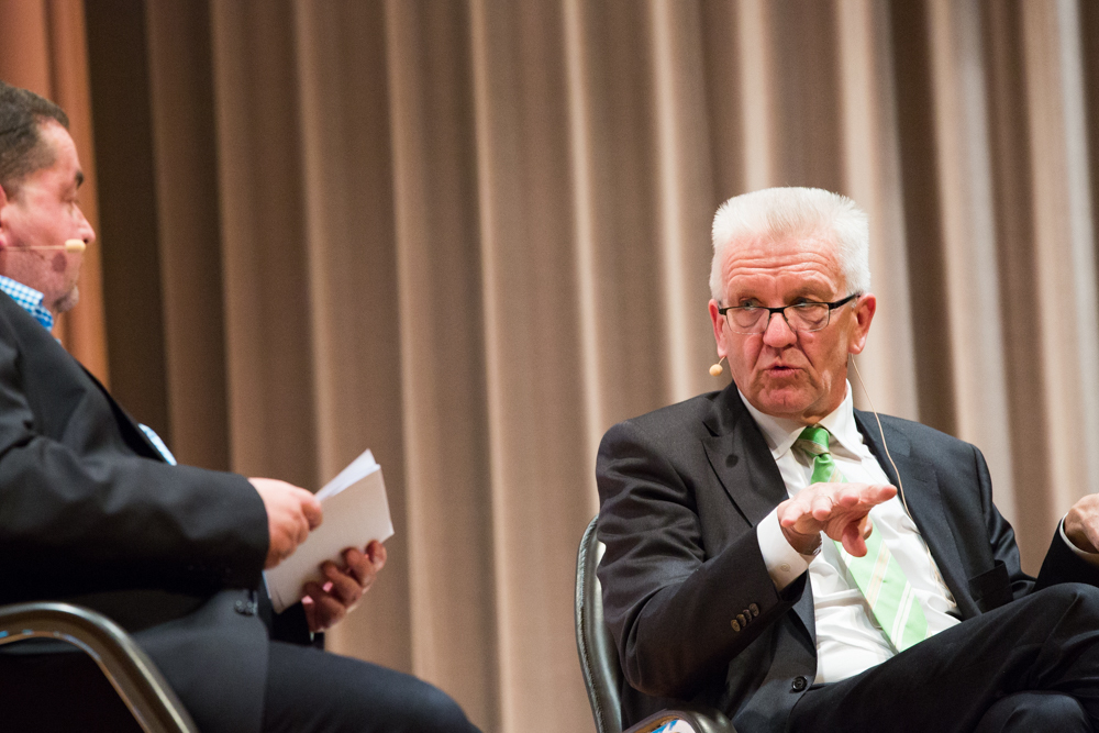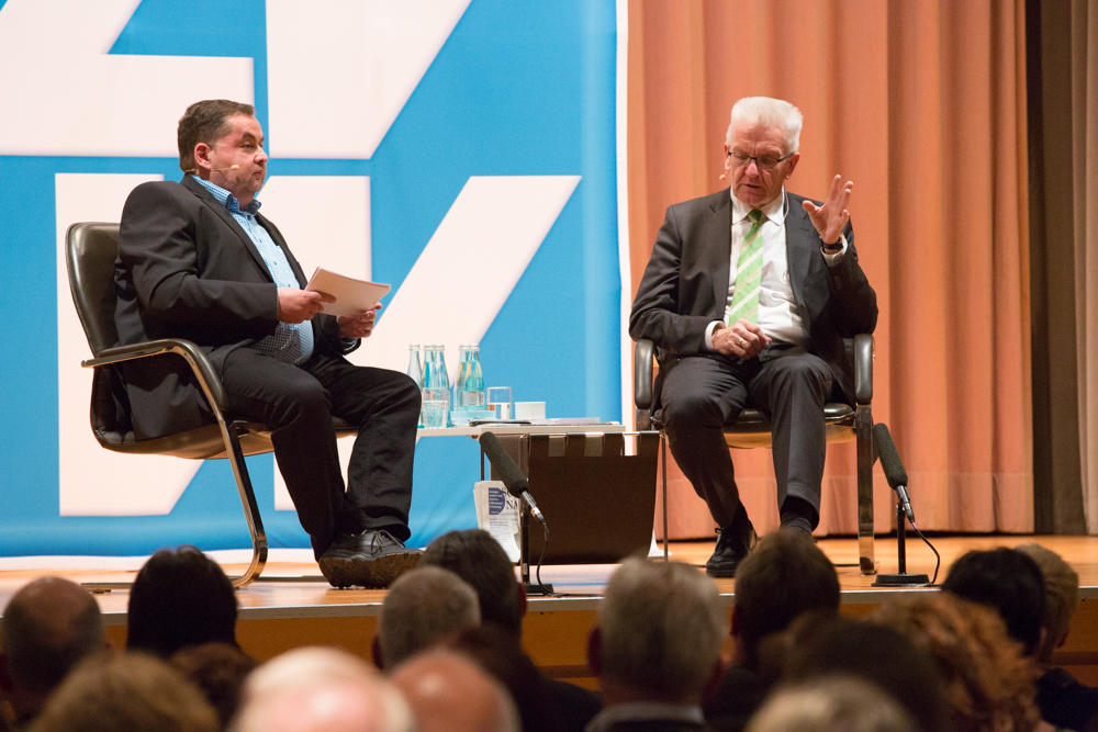 Das ganze Gespräch bekam einen philosophischen Glanz, verbunden mit der Forderung nach Menschenfreundlichkeit und einem zivilisierten Zusammenleben – begründet in Kretschmanns Bewunderung der jüdischen Philosophin und Politologin Hannah Arendt. Auf die, sagte Kretschmann, sei er gestoßen, als er sich von seiner „linksradikalen Phase“ in der Studentenzeit verabschiedet habe. Untrennbar mit dieser Gedankenwelt verbunden ist auch das, was Kretschmann trotz seiner Zugehörigkeit zu den Grünen stets den Ruf des Konservativen einbringt: „Wenn konservativ heißt, dass die Werte, die die Menschheit schon immer hochgehalten hat, auch zukünftig immer gelten, bin ich stockkonservativ.“ Diese Definition habe im Übrigen der ehemalige Ministerpräsident Stefan Mappus mal von ihm gehört und dann flüsternd gesagt: „Au, des muss i mir merken.“