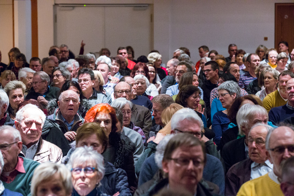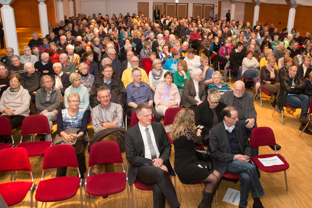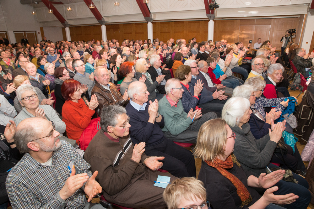 Ganz klar kam Kretschmanns Bekenntnis zur Kanzlerin und ihrer Flüchtlingspolitik. Das Recht auf Asyl, sagte er, sei ein Grundrecht und nicht „irgendein Gnadenakt“. Das Recht auf Asyl gründe auf dem ersten Artikel des Grundgesetzes „Die Würde des Menschen ist unantastbar“. Dieses Gesetz habe keine Obergrenze, sei nicht beliebig und darauf müsse Politik fußen. Es gelte auch der biblische Satz „Liebe deinen Nächsten“. Der gehe aber weiter und zwar mit den Worten „wie dich selbst“. Niemand dürfe die Nächstenliebe so weit treiben, dass er selbst untergehe. Wenn wir die Grenzen im Wunsch, zu helfen, ganz öffneten, könnten wir bald gar nicht mehr helfen. Deshalb könne die Flüchtlingskrise nicht rechtlich, sondern nur politisch gelöst werden. Angela Merkel sei „Politikerin durch und durch“. Und er, Kretschmann, sage: Die Vorkommnisse von Köln waren nicht rechtens, Brandbomben in Flüchtlingsheime zu werfen sei auch nicht rechtens. Wer hier leben wolle, müsse sich an geltendes Recht halten. Das müsse man Menschen aus fremden Kulturen vielleicht manchmal erklären, etwa wenn es um leicht bekleidete Frauen gehe, die halt einfach nur leicht bekleidet seien und sonst nichts. Aber die Menschen kämen ja genau wegen unseres Rechts hierher und deshalb würden wir „den Teufel tun“ und dieses Recht in Gefahr bringen. Unser Recht gelte für alle.