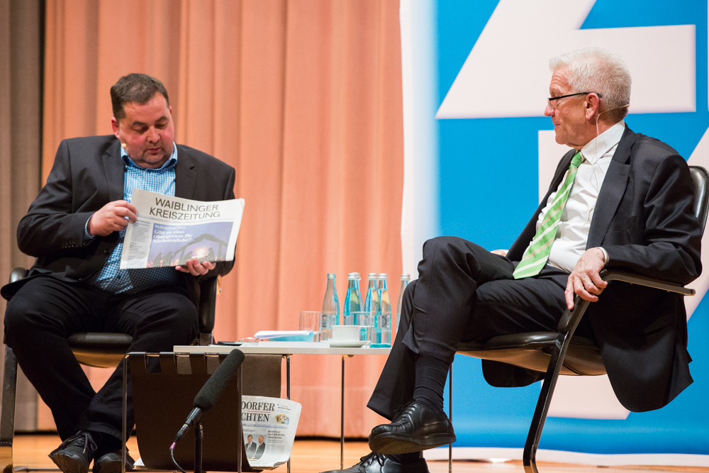 Es war ein besonderer Einstieg ins politische Vorwahlkampf-Geplänkel, das im Übrigen vollständig ausfiel. Winfried Kretschmann verzichtete auf jegliche wahlkampftaktische Bösartigkeit gegenüber der politischen Konkurrenz. Höchstens klitzekleine Spitzchen gönnte er sich, die er aber mit einem besonderen Augenzwinkern gegenüber der eigenen Person ausstattete – zum großen Vergnügen der rund 450 Besucher des Zeitungsverlags in der Endersbacher Jahnhalle. Ministerpräsident Winfried Kretschmann zeigte, was er konnte.