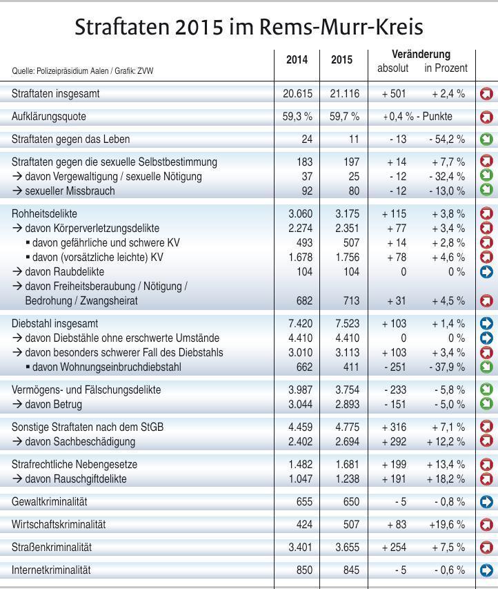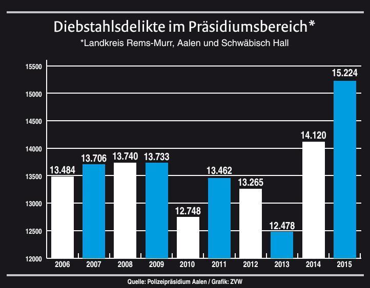 Mit einem Anteil von 35,7 Prozent liegen die Diebstahlsdelikte vorn gefolgt von Vermögens- und Fälschungsdelikten (18,7 Prozent), Sachbeschädigungen (11,6 Prozent), Körperverletzungen (10,8 Prozent) und Rauschgift (6,1 Prozent). Besorgniserregend nannte Möller die Entwicklung bei den Rohheitsdelikten, also gefährlichen Körperverletzungen, Bedrohungen oder Nötigungen. Sie nahmen von 5671 auf 6213 Fälle zu, davon 3175 (2014: 3060) im Rems-Murr-Kreis. Keine schlüssige Erklärung konnte Möller für die Zunahme von Gewaltdelikten an Schulen liefern. Fakt ist, dass der Polizei 81 Fälle bekannt wurden, davon 52 im Rems-Murr-Kreis, zwölf mehr als im Vorjahr. Insgesamt aber waren die Gewaltdelikte rückläufig, zeigt die Statistik bei den Straftaten gegen das Leben, Vergewaltigungen und sexuellem Missbrauch.