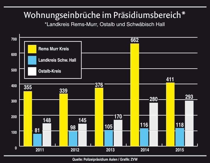 Waiblingen. Der Rems-Murr-Kreis ist nach wie vor ausgesprochen beliebt bei Einbrechern. Im Vergleich zum Rekordjahr 2014 ist die Zahl der Wohnungseinbrüche jedoch deutlich zurückgegangen. Die Bekämpfung des Einbruchdiebstahls ist und bleibt ein Schwerpunkt der Polizei, sagte Kriminaldirektor Reiner Möller bei der Vorstellung der Jahresstatistik des Polizeipräsidiums Aalen.