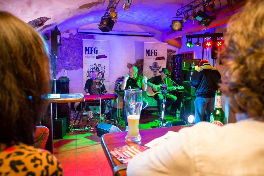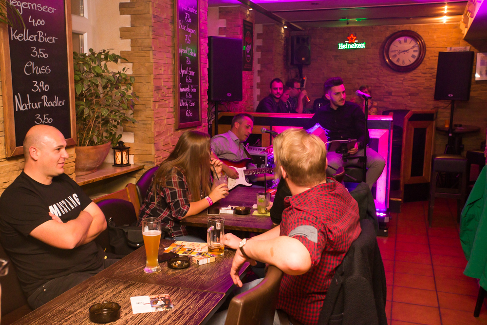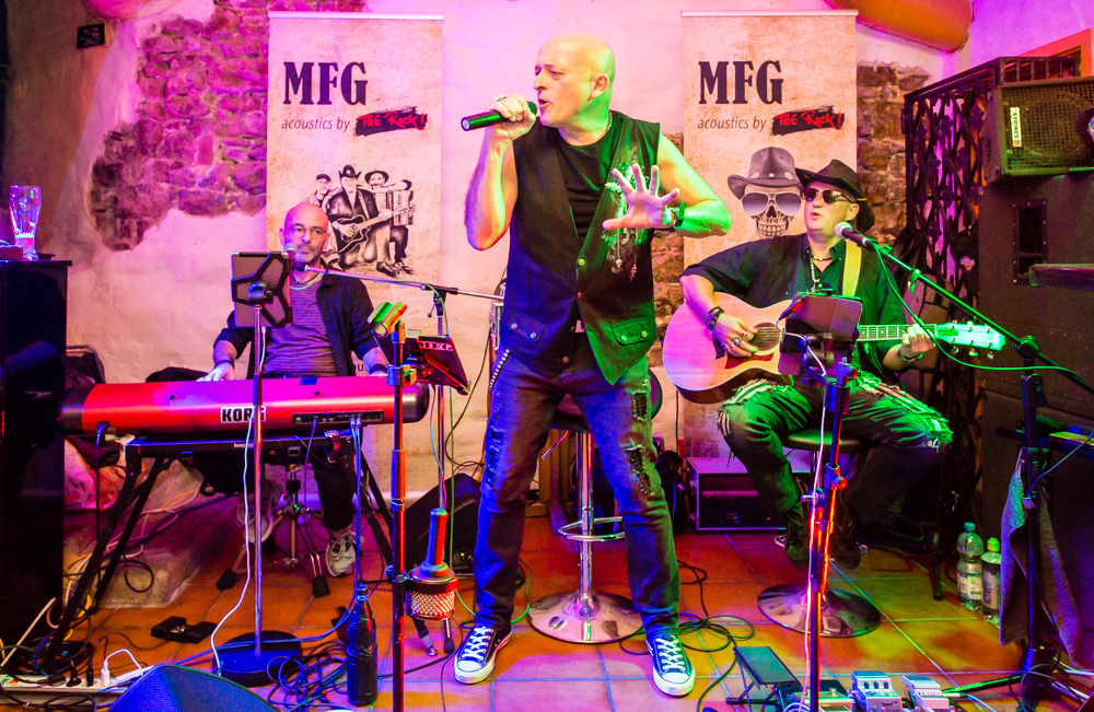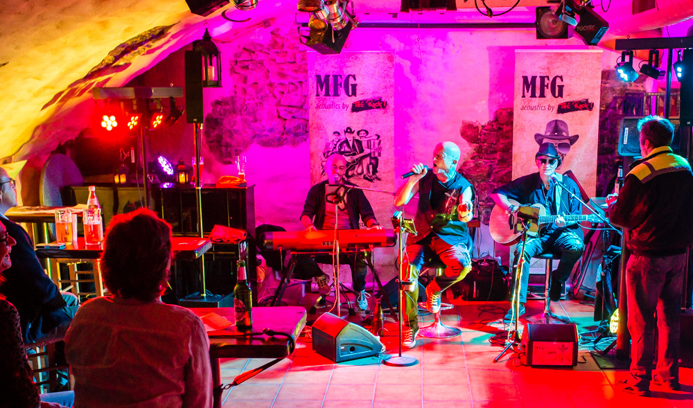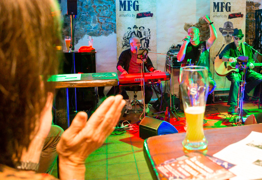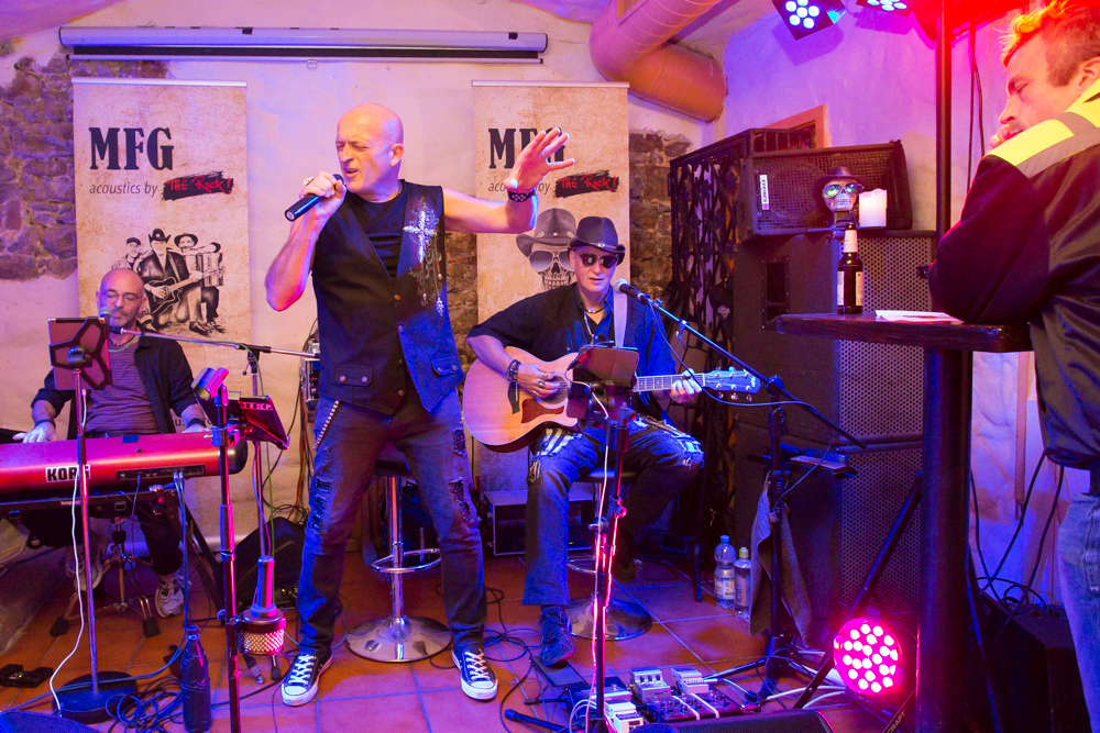 Mit jeder Kneipe weiter in die Altstadt hinein wird’s grooviger und rockiger. In der Brasserie Sonne sind die Örtlichkeiten für zwei Bands gegeben und das wird gern genutzt: Im Gewölbekeller spielt MFG (Metzger, Fuhrmann, Golzem), die abgespeckte Version von „The Rock“. Eine Akustikformation der Waiblinger Hardrockband „The Rock“. Ein Kind, das eher aus der Not geboren wurde, erklärt Leadsänger Martin Metzger, denn zu den Freitagsproben war der Schlagzeuger, ein Feuerwehrmann, oft verhindert.