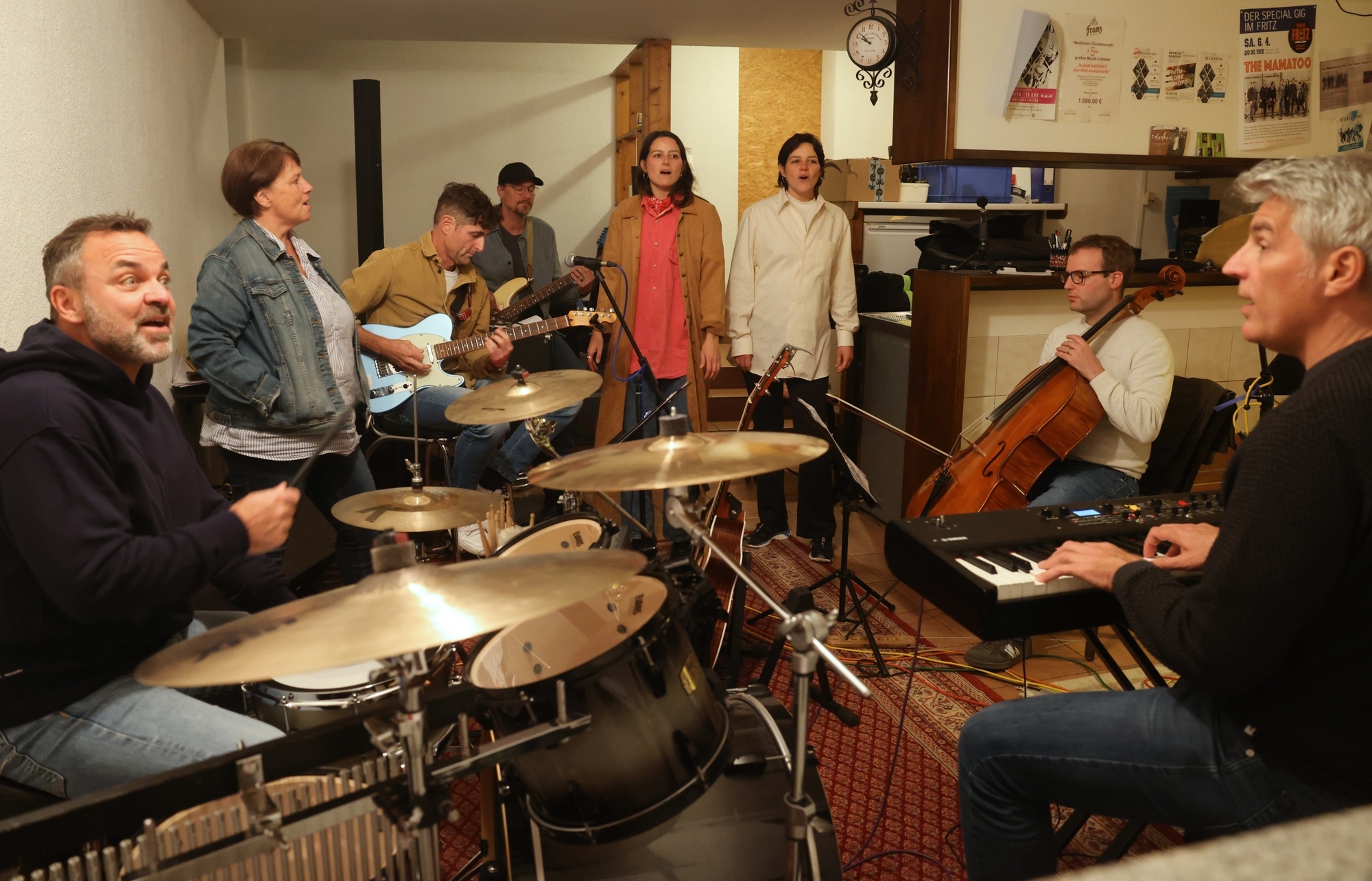 Musik liegt in der Luft, wenn man den Probenraum der Band „The Mamatoo“ in Waiblingen betritt. Rundherum freundliche Gesichter, Spaß und Vertrautheit. Acht Bandmitglieder suchen sich in der ehemaligen Gastwirtschaft „Mariensträßle“ der Familie Lang ihre Plätze. Drei Sängerinnen, fünf Männer an Keyboard, Schlagzeug, Gitarre, Bass und Cello – ganz schön eng, aber kein Problem für das eingespielte Team.