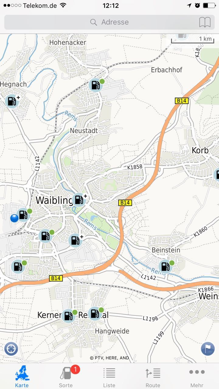 Mit ähnlichen Grund-Funktionen wie bei ADAC ist auch die Clever-Tanken-App einfach bedienbar. Besonders in Waiblingen und Umgebung unpraktisch: In der Listenansicht sucht die App nur nach Tankstellen in einem definierten Umkreis. Diese können zwar nach Preis und Entfernung sortiert werden, aber es landen auch Orte mit kurzer Luftlinien-Entfernung und längeren Fahrwegen mit Staugefahr wie Stuttgart und Esslingen auf dem Radar.