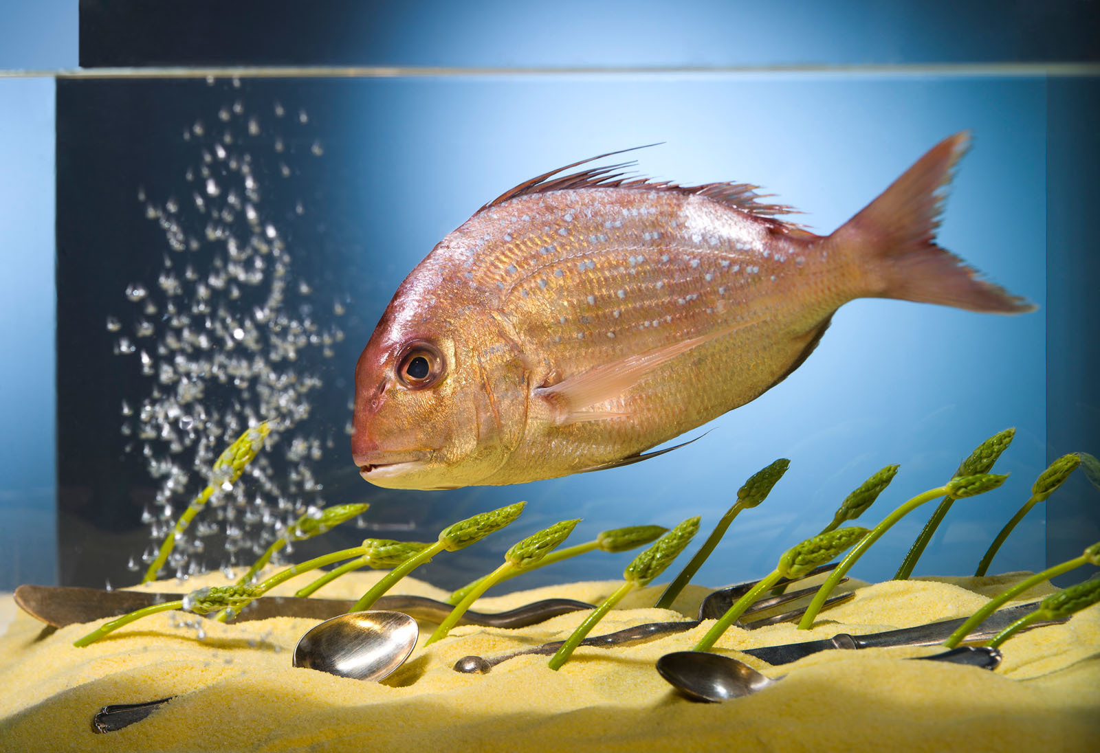 Mit Knalleffekt fotografierte er für eine Stuttgarter Werbeagentur Rosen, Tulpen, Tomaten und Chilis, auf die scharf geschossen wurde. Der Moment des Durchschusses, des Zerreißens der Haut, der Saft-Explosion: Da zeigt Peter Oppenländer ein Stück Wirklichkeit, das sich dem menschlichen Auge sonst entzieht. „Fotografie ist Organisation auf den Zeitpunkt“, sagt er. Vorbilder im engeren Sinne hat er nicht, aber bei den ganz Großen vieles abgeguckt, etwa bei Helmut Newton, Peter Lindbergh, Robert Mapplethorpe und Andreas Gursky. Leute, die Fotografie zur Kunstform erhoben. Je weniger der Kunde reinredet, desto mehr Kunst steckt auch bei Peter Oppenländer im Bild. Wenn er zum Ausgleich die ganz freien Arbeiten macht, kann ziemlich Surreales entstehen. Wie der farbenprächtige Fisch mit Löffeln und Gabeln, eine Hommage an Salvador Dali.
