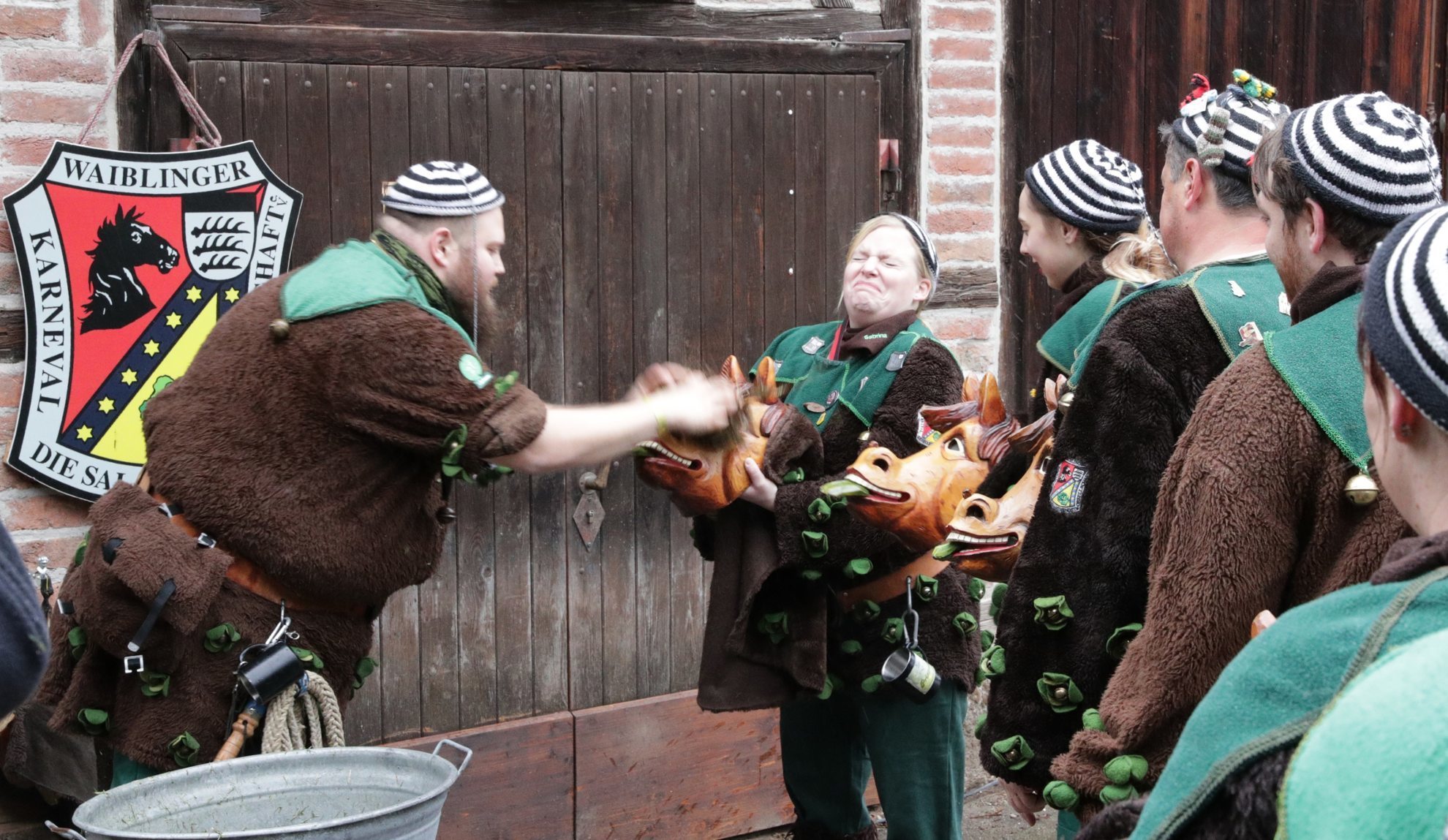 Und so dürfen erst an diesem Tag die Masken, die Larven aus dem Schrank geholt werden. Denn außerhalb der Faschingszeit dürfen sie nicht getragen werden. „Es gibt da einen strengen Ehrenkodex“, sagt Neumann. Und dazu gehört auch das Ritual des Maskenabstaubens. Und das sollte man schon mal erlebt haben. Nachdem also die Narren ihr Häs angelegt haben – grüne Latzhose, eine braune Felljacke mit 65 grünen Stoff-Salatblättern, in deren Mitte Glöckchen angebracht sind, dazu ein Gürtel mit Hufeisen, und schließlich ein schwarz-weiß gestreiftes Mützchen – stellen sie sich erwartungsvoll vor dem Zunftmeister Heiko Liedle auf. Der steht vor einem Waschzuber und braut genüsslich das „Reinigungsmittel“ zum Abstauben der Masken, also den Pferdeköpfen der Salathengste, zusammen.