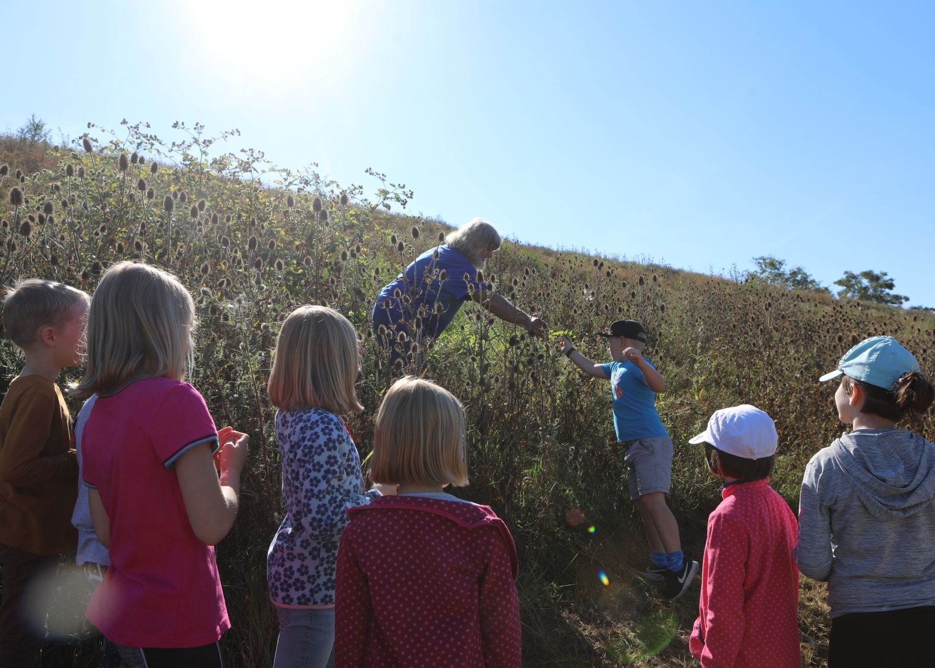 Es summt und zirpt auf dem Finkenberg, die Sonne strahlt auf das ehemalige Deponiegelände an der Korber Höhe. Unter Pavillons genießen Schulkinder ihre Ferien auf der Waiblinger Jugendfarm. Sie kleben Blumen, die sie eben auf einem der drei Hügel gesammelt haben, auf Papier und benennen die Pflanzen. Unter den Fundstücken sind lila blühende Disteln, wie sie auf vielen Wiese zu finden sind, aber auch seltene Pflanzen. Sie alle sind Teil der bunten Blumenwiesen, die wichtig für Bienen und