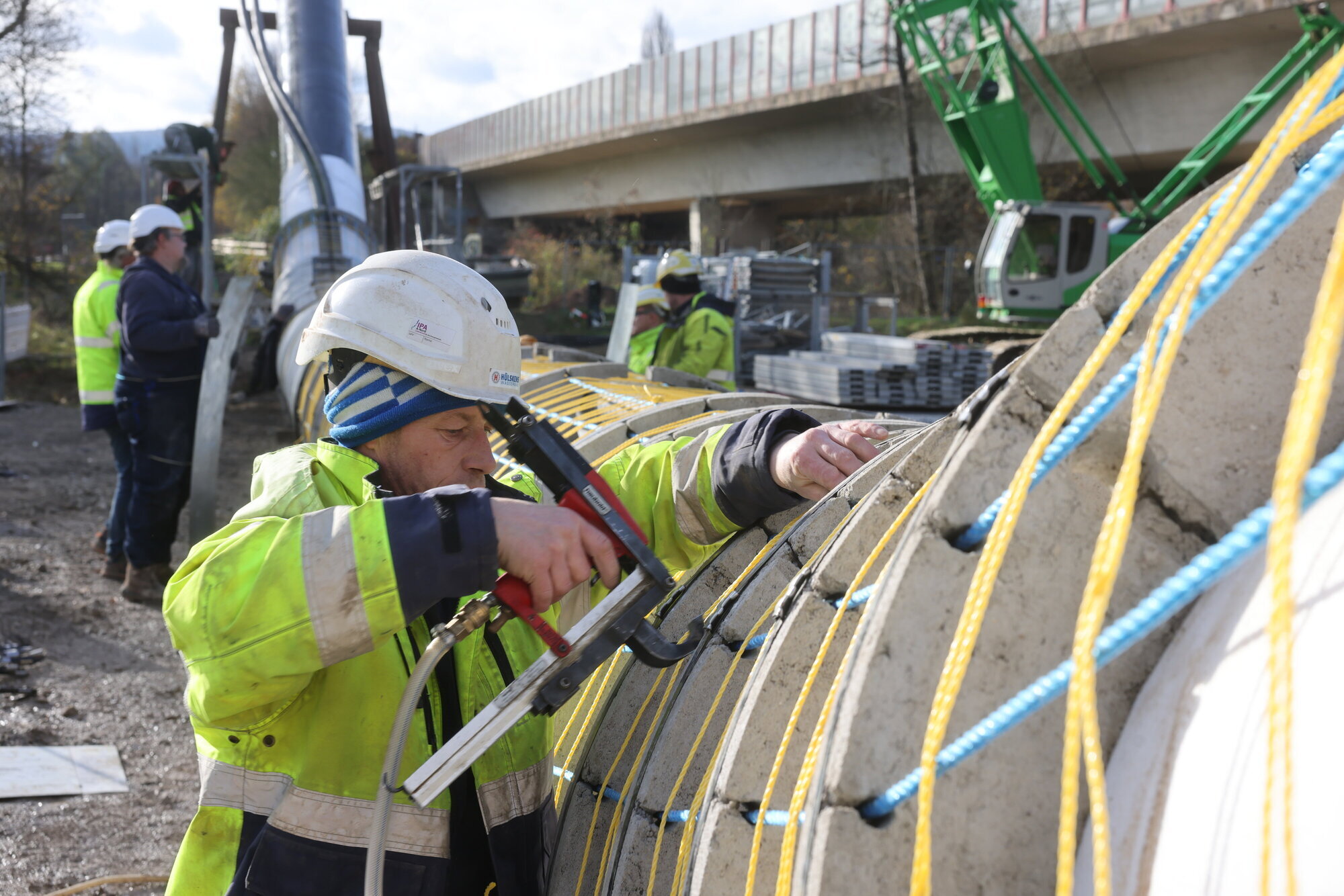 Waiblingen. Oben rauscht der Verkehr der B14, hier unten am lauert ein Monstrum am Ufer der Rems. Es ist 50 Meter lang und mit 70 Tonnen etwa so schwer wie die größten Riesensaurier, die je gelebt haben: Der Düker, mit dem die Süddeutsche Erdgasleitung SEL die Rems unterqueren wird, liegt bei der Waiblinger Rundsporthalle bereit. Anfang des Jahres 2026 wird er unter dem Flussbett verlegt. Die mehrmonatige Verzögerung beim Bau hat nichts mit dem tragischen Unfall vom Sommer