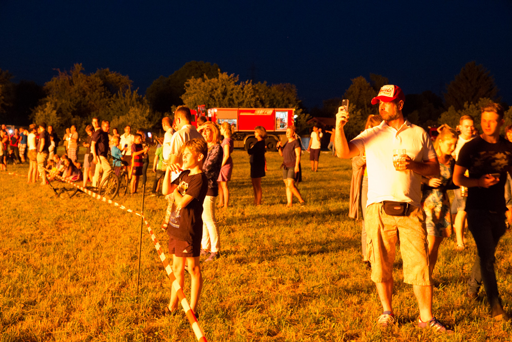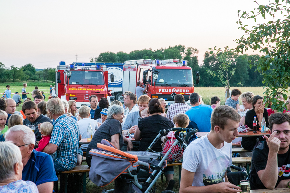Ganz offensichtlich war gerade für Kinder der Festabend ein wahres Paradies. Nicht nur von den abgestellten Feuerwehrfahrzeugen ging eine oft schier unwiderstehliche Faszination aus. Zum ausgelassenen Toben genügte bisweilen ein Erdhaufen, eine Hand voll Heu, der Feldweg oder die sich schier endlos erstreckende abgemähte Wiese rund um den Palettenturm.