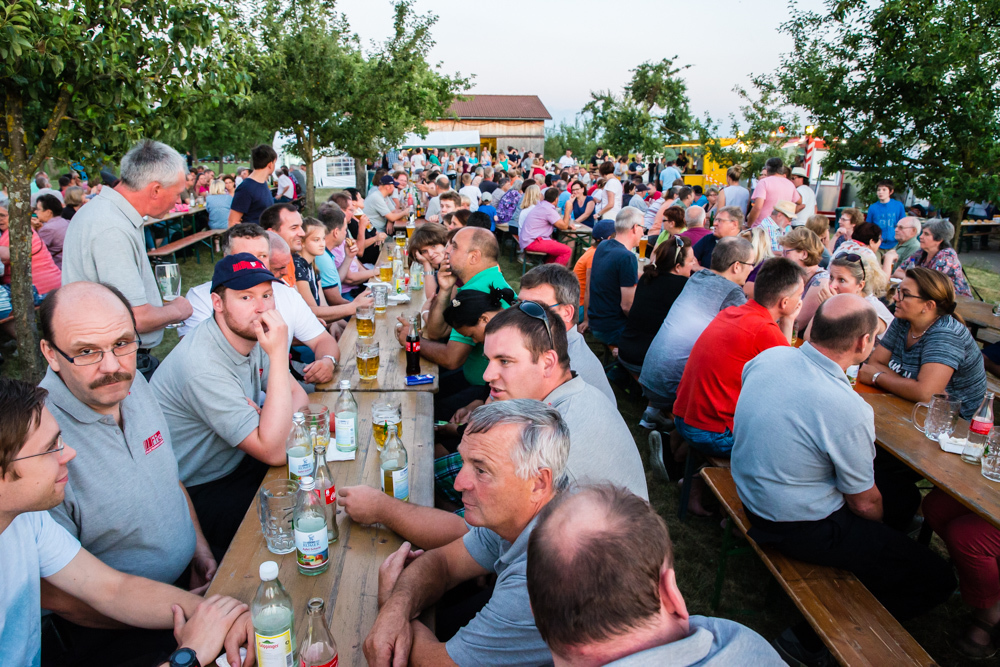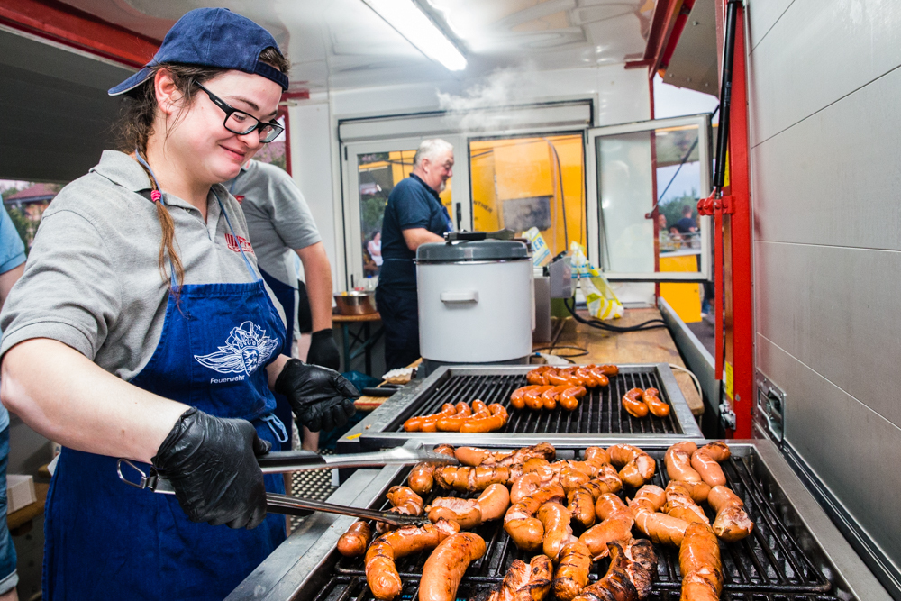 Versorgt wurden die Festbesucher von an die siebzig Feuerwehrangehörigen. Sowohl die Aktiven als auch Alters- und Jugendwehr waren im Einsatz. Der Palettenturm wurde bereits am Freitag aufgebaut, den Samstag über dann die Festwiese vorbereitet, die Biergarnituren aufgeschlagen und die Grills vorbereitet.