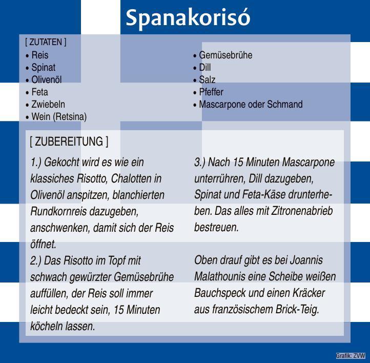 Küchenchef Joannis Malathounis, der seit zwei Jahren für sein Stettener Speiserestaurant einen Michelin-Stern führt, bezeichnet sich als „schwäbischen Griechen“. Die Mutter stammt von Epirus an der Nordwestküste Griechenlands, der Vater von der Halbinsel Pilion an der Ostküste. Geboren wurde der Mann mit dem leicht schwäbelnden Zungenschlag in Stuttgart. Schon seine Mutter hatte das Spanakorisó, einen griechischen Spinatreis bäuerlichen Ursprungs, mit regionalen Zutaten wie Olivenöl, Feta, Retsina, Gemüsebrühe und Dill zubereitet. „Aber sie hat nie nach Rezept gekocht. Meine Mutter hat alles in einen Topf getan und fertig. Die Hausfrauen haben das raus. Das kocht 20 Minuten und dann stimmt das von der Konsistenz.“