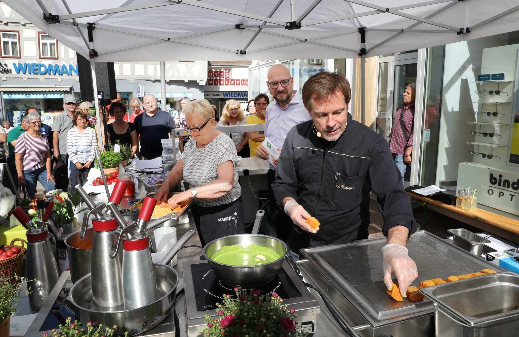 Kochshow und Kinderbastelaktion auf dem Waiblinger Wochenmarkt. Der Waiblinger Sterne-Koch Bernd Bachofer zeigt live , was mit dem Gemüse möglich ist. Kinder können mit Frieder Bayer Kürbisse für Halloween bemalen.