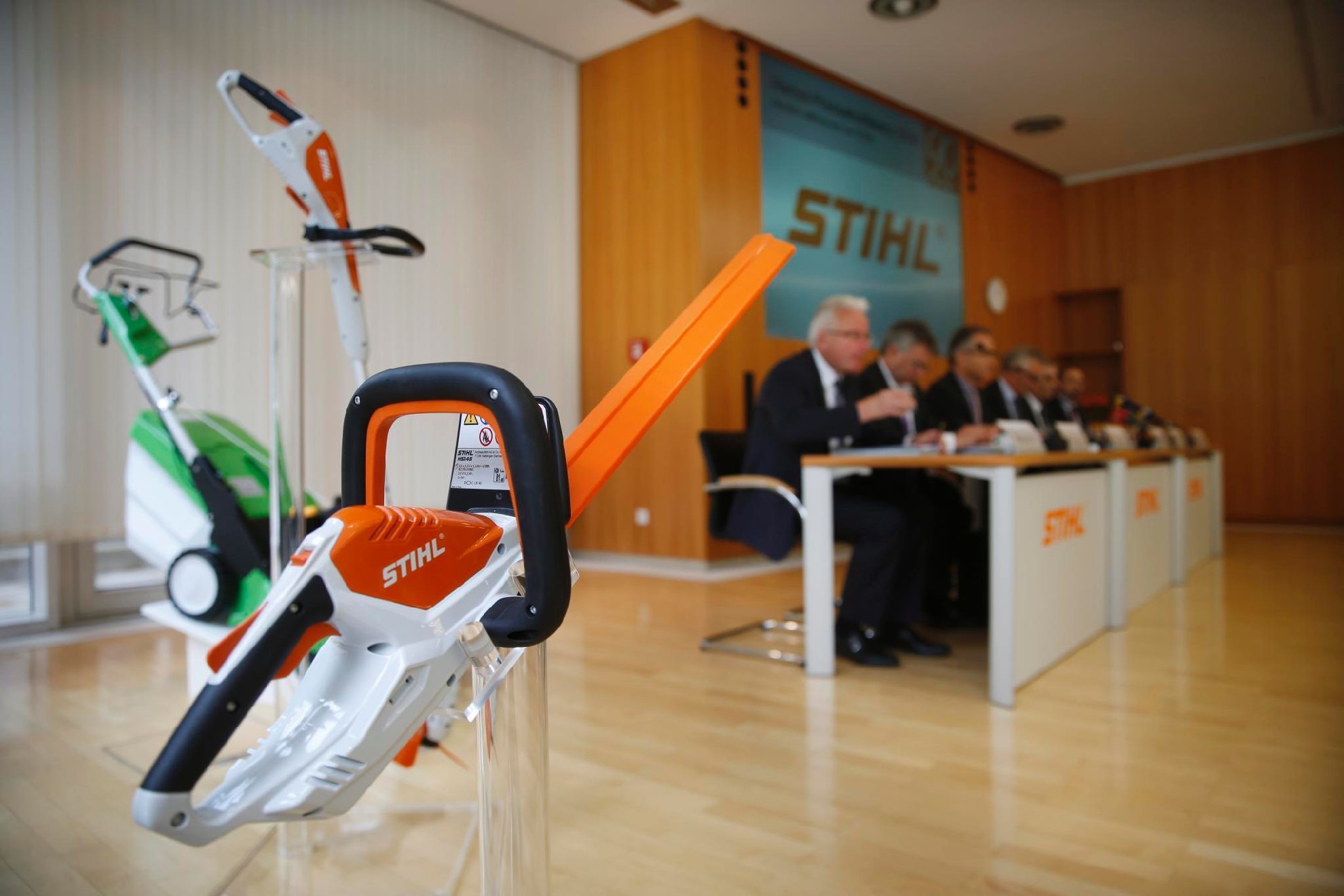 Grün-orange Produktpalette bei der Pressekonferenz von Stihl in Waiblingen. Bereits seit Anfang der 90-er-Jahre gehören die grünen Viking-Produkte zu Stihl. Nun schlupft die Marke unter die orange Dachmarke von Stihl. (Archivbild) © Büttner / ZVW